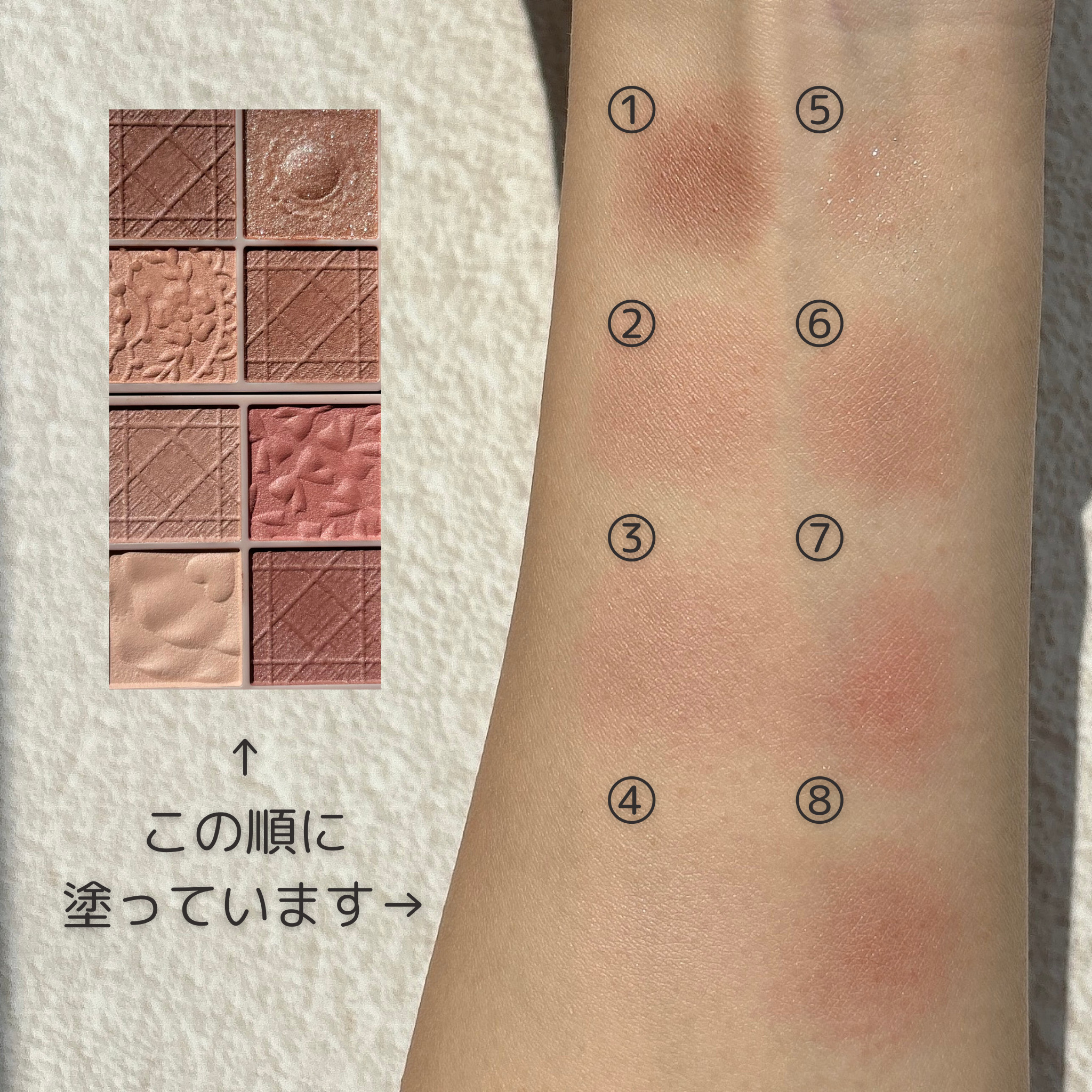 - いつでも一緒♡多色なのに持ち歩ける! 8色入りアイシャドウパレットのマットタイプ♪ 多色パレットでありながら、「持ち歩けること」と「外出先でもメイク直しができること」にこだわったアイシャドウパレット。 ダブルエンドチップ付です♪ マットが大好きな方にも、少し苦手意識がある方にも手に取っていただきたく全色マットor1色ラメ入りの構成にしています♪ (M01:全色マット、M02・M03:1色ラメ入り) 全体は同系色で統一しており、全色使いやすいパレット。 色の組み合わせは自由に♡自分好みのメイクを楽しめます! 【マット】 隠ぺい感とふわっと感を両立させた質感♪ なめらかで重ねても粉っぽくなりにくく、厚塗り感のない仕上がり。 伸びが良いのでムラになりにくく、しっとりフィットして仕上がりを長時間キープ✨ 【ラメ】 ラメ・パールだけがのる透明感のある仕上がり。 高輝度なガラスパール配合で、高見えする輝き✨ なめらかで粉っぽくならず、しっとり密着して仕上がりを長時間キープ! サラサラしたマットシャドウにもラメがしっかり密着する処方を追求しました♪ 蓋にはマット感を表現したすりガラス風のグラデーションデザインが、パウダー部分にはリボンやレース・ボタンの型押しが入っているなど、デザインにもこだわっています♡