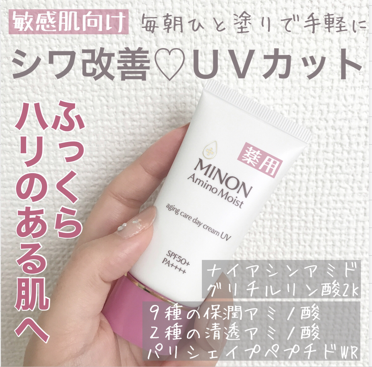面倒くさい日はコレ1本💖 ミノン アミノモイスト エイジングケア デイクリームUV SPF50+ PA++++ 1本で3つの機能 敏感肌向け、エイジングケア 薬用シワ改善 UVクリーム 有効成分 ナイアシンアミド配合 うるおい満ちて、ふっくらハリのある肌へ ▓無香料 ▓合成着色料フリー