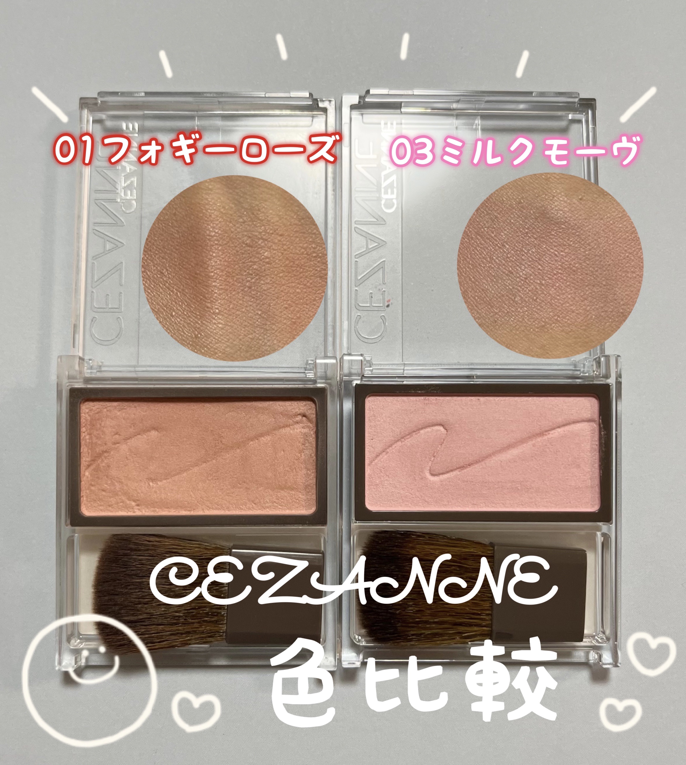 CEZANNEチークブラッシュ01フォギーローズ03ミルクモーヴ¥550ブラシでひと塗りだとぽわっと発色くらいかな🐇ピンクメイクの時はミルクモーヴは本当にかわいい♡フォギーローズはローズというよりオレンジって感じになる🍊ミルクモーヴのほうも重...