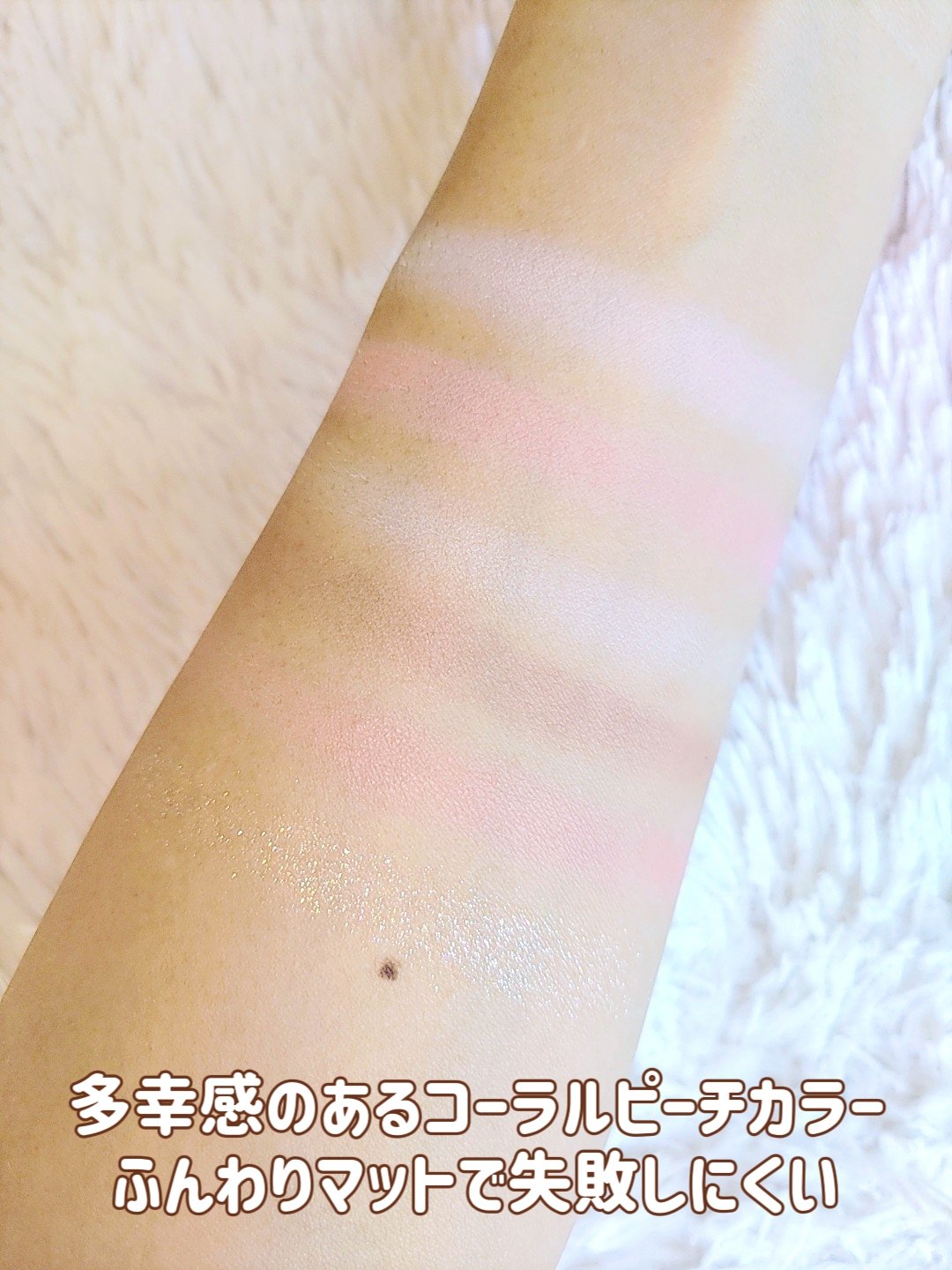 もう見た瞬間ハートの可愛さにめちゃときめいた これはもうベスコスですね! 全体的なバランスも良くてマット、ラメ、パールと一通りそろってます チークも白みのあるオレンジカラーとピーチカラー ハートの部分は白っぽいカラーとピンクっぽいカラー ピンクは結構カラーがでるのでノーズには向かないかな、頬のハイライト兼チークとしてがおすすめ