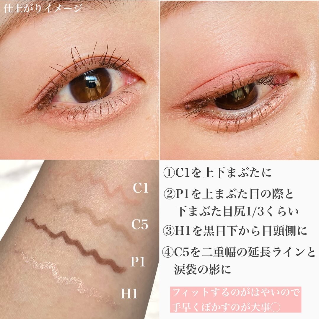 - <H1 クールデューイ> シクロペンタシロキサン、トリメチルシロキシケイ酸、マイカ、メチルトリメチコン、合成ワックス、酸化チタン、(アクリレーツ/アクリル酸ステアリル/メタクリル酸ジメチコン)コポリマー、 CI 77491、セレシン、キャンデリラロウ、トリイソステアリン酸ポリグリセリル-2、合成フルオロフロゴパイト、ジメチコン、カプリル酸グリセリル、カプリリルグリコール <H2 ウォームデューイ> シクロペンタシロキサン、トリメチルシロキシケイ酸、マイカ、メチルトリメチコン、合成ワックス、酸化チタン、(アクリレーツ/アクリル酸ステアリル/メタクリル酸ジメチコン)コポリマー、セレシン、キャンデリラロウ、トリイソステアリン酸ポリグリセリル-2、 CI 77491、ジメチコン、CI 77499、カプリル酸グリセリル、カプリリルグリコール <C1 桃花ツイム> シクロペンタシロキサン、メチルトリメチコン、トリメチルシロキシケイ酸、マイカ、合成ワックス、酸化チタン、(アクリレーツ/アクリル酸ステアリル/メタクリル酸ジメチコン)コポリマー、シリカ、キャンデリラロウ、 CI 77491、カルミン、(エチレン/プロピレン)コポリマー、黄色4号、ジメチコン、CI 77492、CI 77499、マルトデキストリン <C2 ピーチツイム> シクロペンタシロキサン、メチルトリメチコン、トリメチルシロキシケイ酸、酸化チタン、合成ワックス、マイカ、(アクリレーツ/アクリル酸ステアリル/メタクリル酸ジメチコン)コポリマー、シリカ、キャンデリラロウ、 CI 77491、黄色4号、カルミン、(エチレン/プロピレン)コポリマー、ジメチコン、マルトデキストリン <C3 ローズツイム> シクロペンタシロキサン、メチルトリメチコン、トリメチルシロキシケイ酸、マイカ、合成ワックス、酸化チタン、(アクリレーツ/アクリル酸ステアリル/メタクリル酸ジメチコン)コポリマー、 CI 77491、CI 77492、シリカ、キャンデリラロウ、カルミン、CI 77499、(エチレン/プロピレン)コポリマー、黄色4号、ジメチコン、マルトデキストリン <C4 ボントゥビツイム> シクロペンタシロキサン、メチルトリメチコン、トリメチルシロキシケイ酸、酸化チタン、合成ワックス、マイカ、 CI 77491、CI 77492、CI 77499、(アクリレーツ/アクリル酸ステアリル/メタクリル酸ジメチコン)コポリマー、シリカ、キャンデリラロウ、(エチレン/プロピレン)コポリマー、青色1号、ジメチコン <C5 ニュートラル影> シクロペンタシロキサン、メチルトリメチコン、トリメチルシロキシケイ酸、酸化チタン、合成ワックス、マイカ、CI 77492、(アクリレーツ/アクリル酸ステアリル/メタクリル酸ジメチコン)コポリマー、CI 77499、シリカ、キャンデリラロウ、 CI 77491、(エチレン/プロピレン)コポリマー、ジメチコン <P1 ブラウンアイズ> メチルトリメチコン、 CI 77491、合成ワックス、CI 77499、イソドデカン、CI 77492、マイカ、セレシン、シリカ、キャンデリラロウ、(VP/ヘキサデセン)コポリマー、(アクリレーツ/アクリル酸ステアリル/メタクリル酸ジメチコン)コポリマー、ポリヒドロキシステアリン酸 <P2 ブラックブラウン> トリメチルシロキシケイ酸、メチルトリメチコン、CI 77499、合成ワックス、イソドデカン、 CI 77491、CI 77492、マイカ、セレシン、シリカ、キャンデリラロウ、(VP/ヘキサデセン)コポリマー、(アクリレーツ/アクリル酸ステアリル/メタクリル酸ジメチコン)コポリマー、ポリヒドロキシステアリン酸、レシチン、ジメチコン、 パルミチン酸エチルヘキシル、イソステアリン酸、ミリスチン酸イソプロピル、カプリル酸グリセリル、カプリリルグリコール、ポリリシノレイン酸ポリグリセリル-3