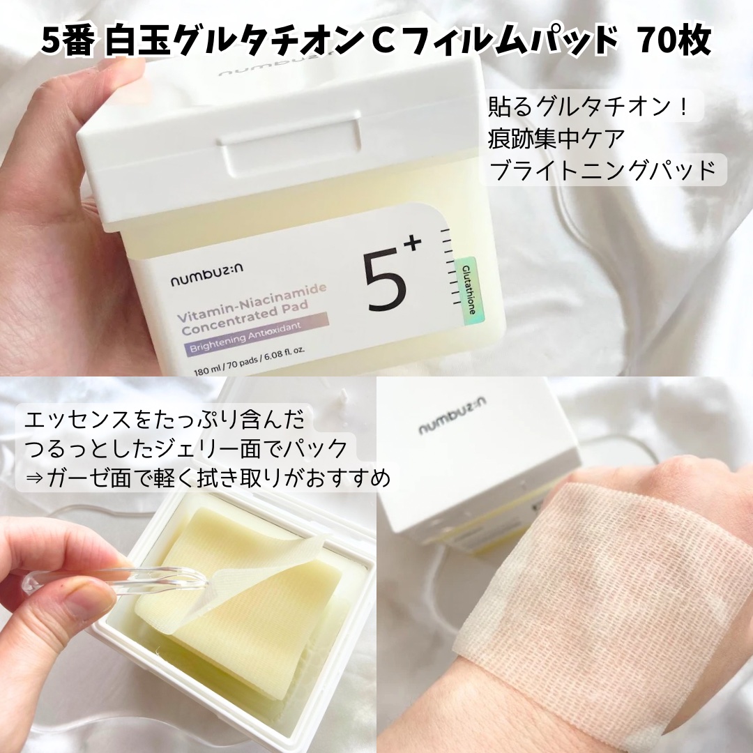 グルタチオン(整肌成分)とビタミン(整肌成分)をそのままぎゅぎゅっと1枚のフィルムパッドに! ぷるんとしたジェリー面でしっかりうるおいケア。ガーゼ面で拭きとりケアができる◎ ベタつかずにうるおい感もしっかりあって私はナンバーズインのパック系ではこの白玉グルタチオンCフィルムパッドが1番お気に入りかも!