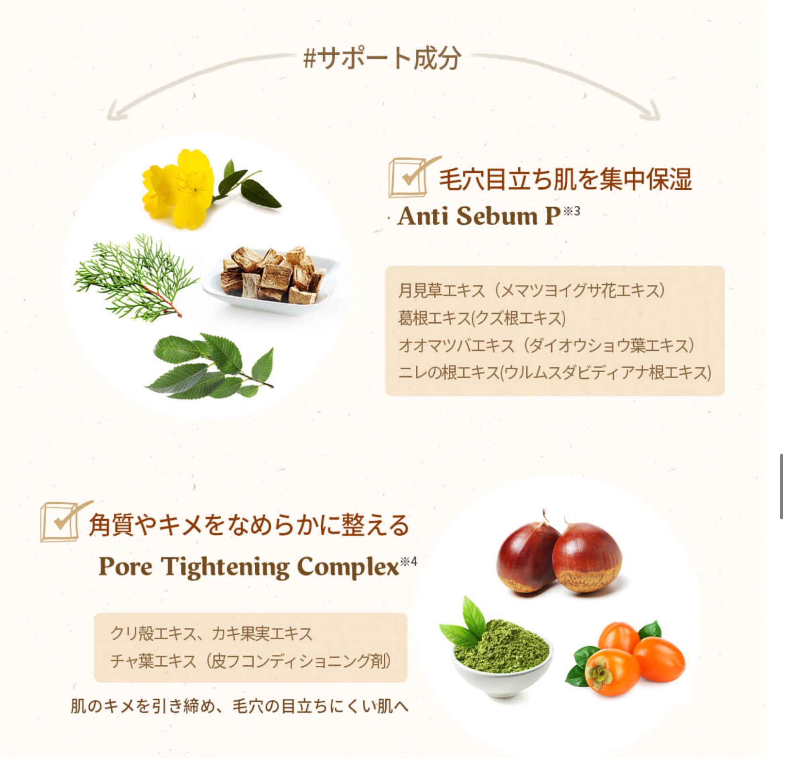 - <本体> 水、クヌギエキス、プロパンジオール、BG、グリセリン、ナイアシンアミド、エタノール、グルコノラクトン、クエン酸Na、トロメタミン、ヒドロキシアセトフェノン、PPG-13デシルテトラデセス-24、1,2-ヘキサンジオール、ハマメリスエキス、アラントイン、オプンチアフィクスインジカ茎エキス、アデノシン、ラウリン酸ポリグリセリル-10、カキ果実エキス、チャ葉エキス、クリ殻エキス、ヒアルロン酸Na、クエン酸、ヒドロキシエチルセルロース、エナンチアクロランタ樹皮エキス、フィチン酸Na、デキストリン、β-グルカン、カカオ種子殻エキス、ユーカリ葉油、ローズマリー葉油、アミリスバルサミフェラ樹皮油、カプリリルグリコール、加水分解シロバナルーピンタンパク、セージ油、(アクリル酸グリセリル/アクリル酸)コポリマー、ベルガモット果実油、クズ根エキス、ウルムスダビディアナ根エキス、メマツヨイグサ花エキス、ダイオウショウ葉エキス、ヒマワリ種子油、オニサルビア油、パルミトイルトリペプチド-5、オレアノール酸