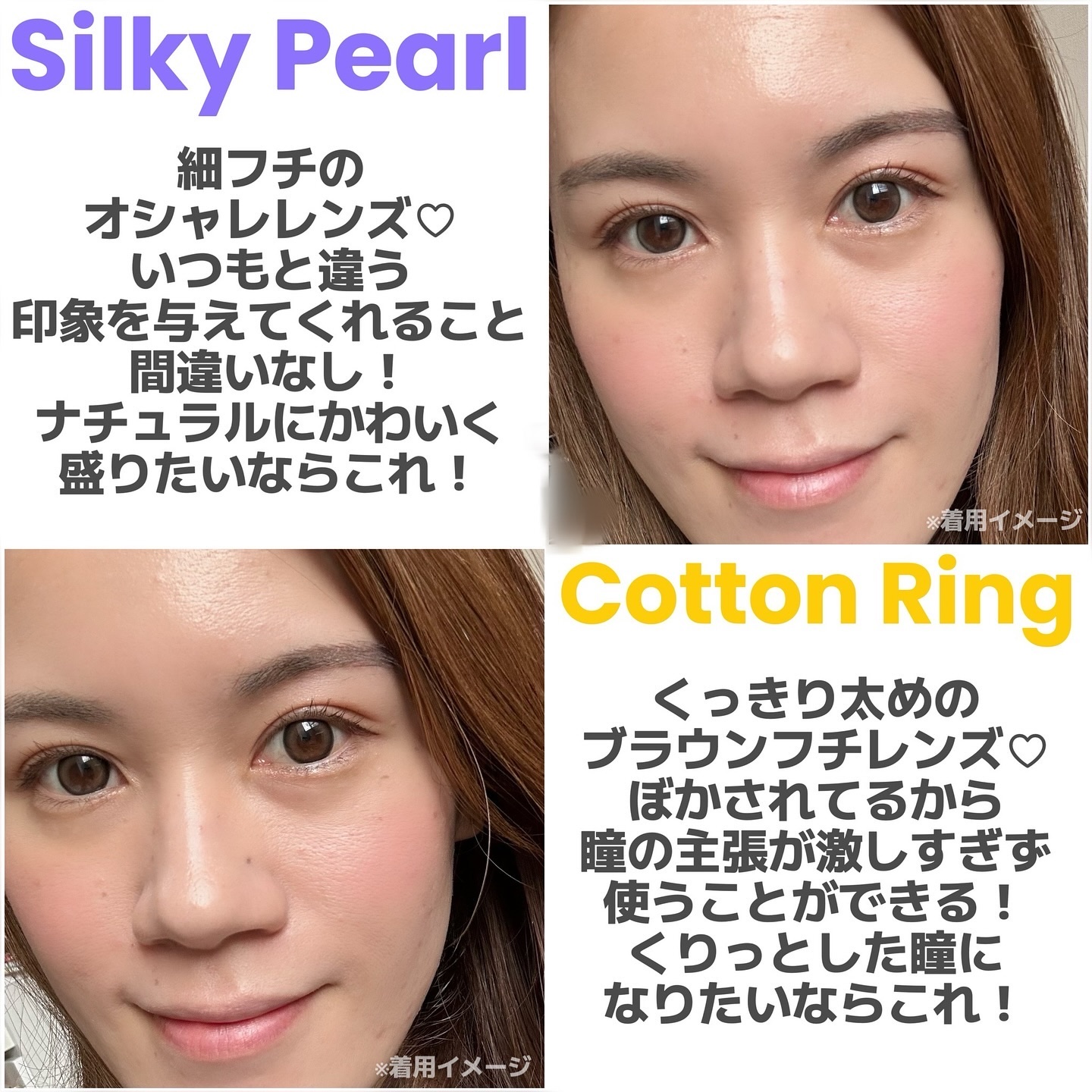 - ※2025年6月以降、商品パッケージ裏面・側面の一部表記を順次変更いたします。尚、これにかかる商品の交換・返品は承っておりません。 ふわっと漂う多幸感 キラキラとした瞳 そんな多くの人が憧れる印象はmelloewで作れる! 王道盛れからあざと盛れまでどんな盛れも叶うラインナップで瞳をコーディネート☆ Cotton Ring(コットンリング) DIA14.2㎜/着色直径13.5㎜ 溶け込みベージュ×くっきりフチ 写真でもリアルでも盛れちゃう♪ Silky Pearl(シルキーパール) DIA14.2㎜/着色直径13.5㎜ ツヤっぽベージュ×細フチ 垢抜けた印象にしたい方におすすめ♪ Truffle Gray(トリュフグレー) DIA14.2㎜/着色直径13.4㎜ おしゃれモテ♡ 濃いめグレージュ×ぼかし細フチ 品よく盛れるお嬢様な瞳に Pure Nude(ピュアヌード) DIA14.2㎜/着色直径13.2㎜ 絶妙ヌーディカラー×グラデフチ お仕事やカラコン初心者にもおすすめ♪ Brown Chou(ブラウンシュー) DIA14.2㎜/着色直径13.6㎜ まろやかブラウン×ぼかしフチ 日常使いにもおすすめ♪ Mocha Powder(モカパウダー) DIA14.2㎜/着色直径13.6㎜ リピ確モテ♡ ふわふわモカ×くりっとフチ 絶対盛れちゃう甘い瞳に Love Cacao(ラブカカオ) DIA14.2㎜/着色直径13.0㎜ 清楚モテ♡ とろふわチョコレート×こっそりフチ バレずに盛れちゃう瞳に カラーコンタクトレンズの不適正使用による眼障害の危険性等などがあります。 ●コンタクトレンズは高度管理医療機器です。不十分な洗浄・消毒など不適切なケアや、長時間・交換期間を超えた装用により、アレルギー性結膜炎、角膜感染症、角膜潰瘍等の重篤な眼障害が発生する危険性があります ●ご使用前に取扱説明書を確認してください 使用上の留意事項 ●眼科医院等を受診してからお求めください ●眼に異常を感じたら直ちにレンズ使用を中止し、お近くの眼科等で診察を受けてください ●医師の指示にしたがってご使用ください ●コンタクトレンズを装用する場合、自覚症状がなくても、眼科医院等での定期検査を受けてください ●レンズに不具合がある場合は使用しないでください
