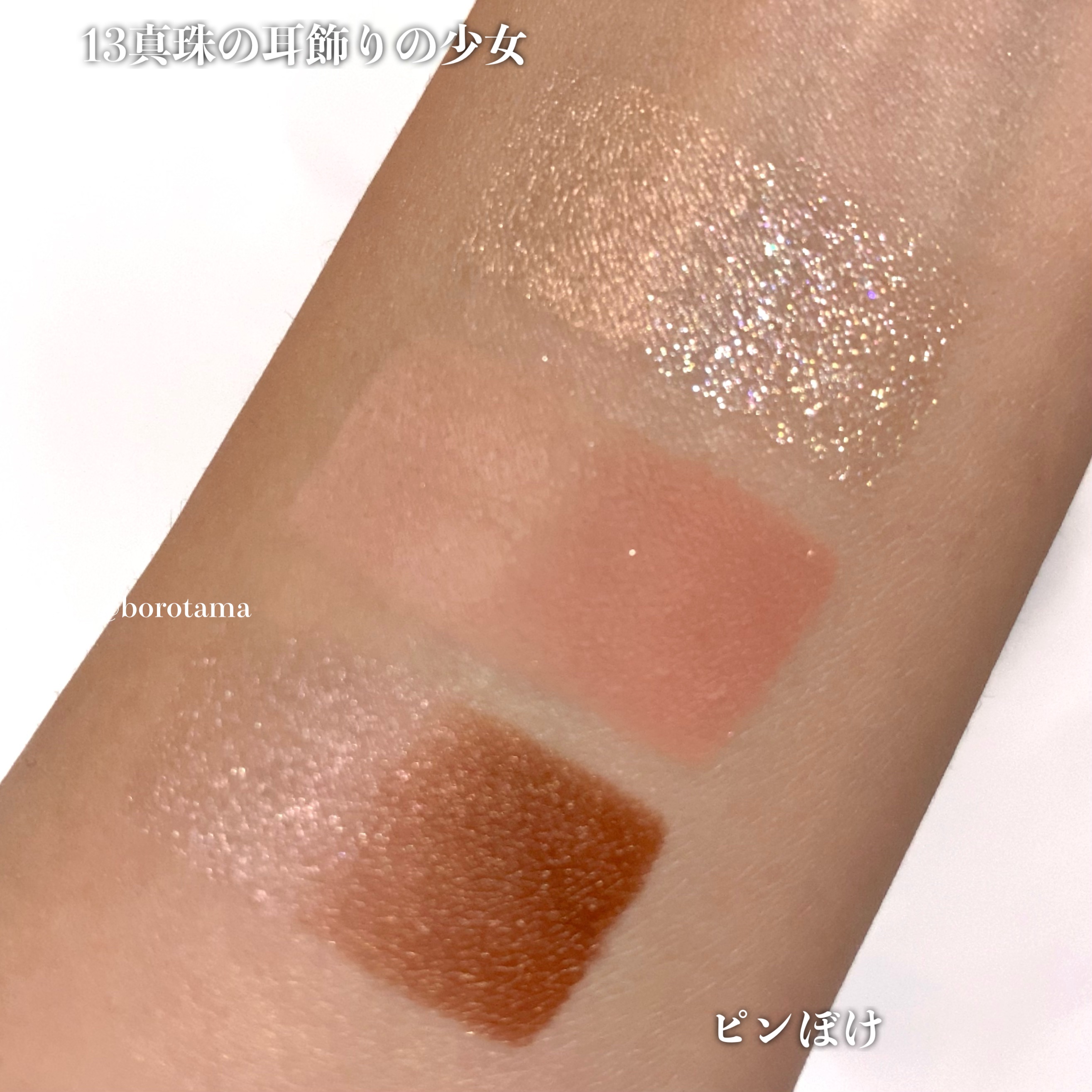 柔らかい色味と真珠やドレープのデザインが印象的なパレット。 絵画の世界観が忠実に表現されてて眼福🥹 特に左上のパール見てほしい!この光り方、まさに真珠じゃない!?💫 使いやすいかつオシャレなパレット。 絵画アイシャドウパレットはカラバリも豊富なのでお気に入りの色味が見つかるはず!