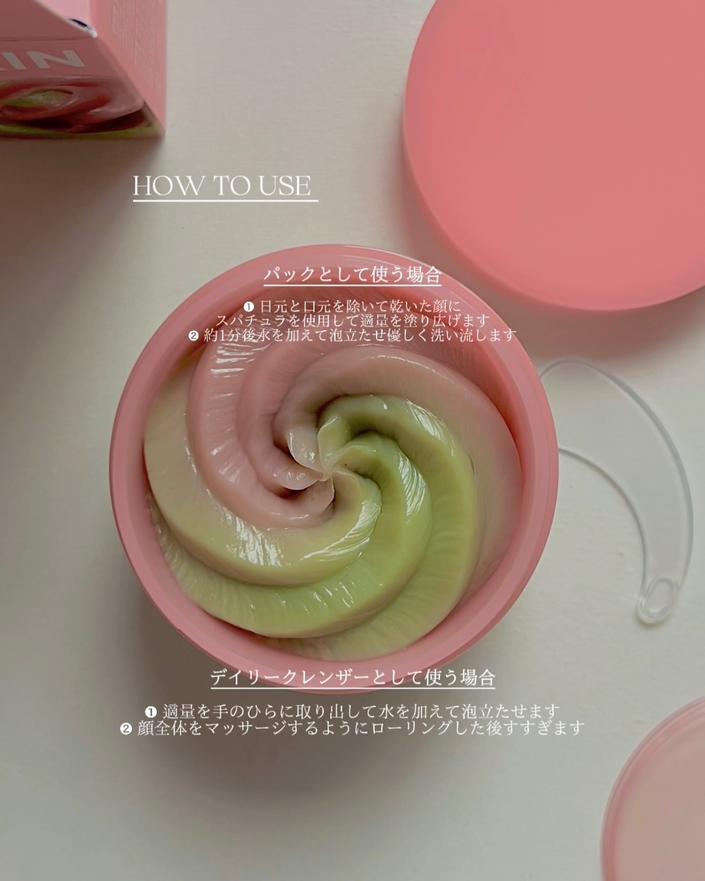 ホイップのようなクレンザー。ピンクと緑色で、見た目がとっても可愛いです。 しっとりなめらかなテクスチャーのクレンザー。泡立ちが良く、優しく洗うことが出来ます。 メレンゲのようなもちもちしたテクスチャー。柔らかくて弾力のあるテクスチャーが毛穴に密着。