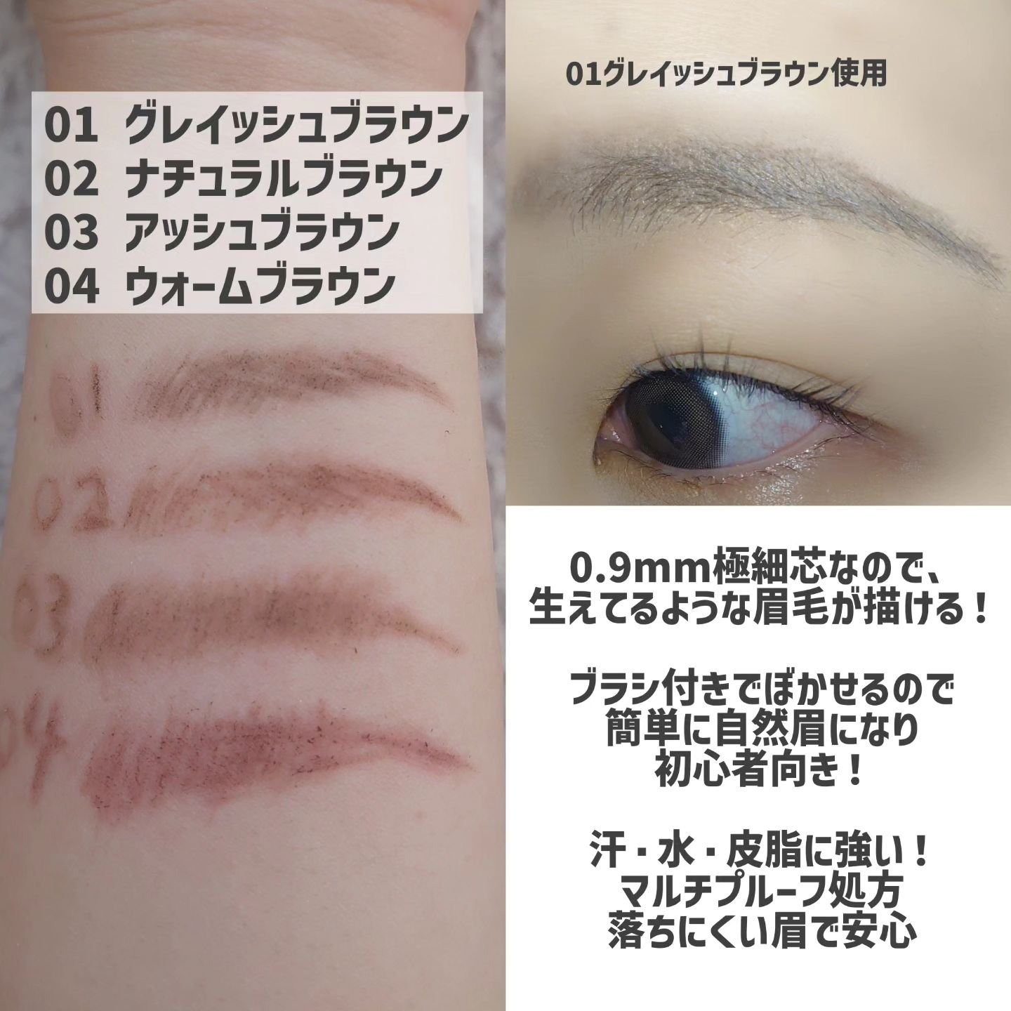 - ・より使いやすく!デザインとカラー展開をリニューアル! 「ブラシ付き」を分かりやすくパッケージと本体を改良。カラーも人気の3色にアップデート。 ・24時間消えない*耐久テスト*クリア処方! 汗・皮脂・水に強いウォータープルーフ処方で、朝描いた眉を夜までしっかりキープします。 ・まるで植毛のようにリアルな眉が描ける 【極細0.9mm芯】 繊細に描けるため、眉尻などの細かい部分の調整も自由自在。 【マイクロブラシ】 描いたラインを自然にぼかせる細型の極細毛ブラシで、よりリアルに。 パンテノール配合(保湿) ※2025年3月18日〜パッケージ・商品名・カラー展開 リニューアル