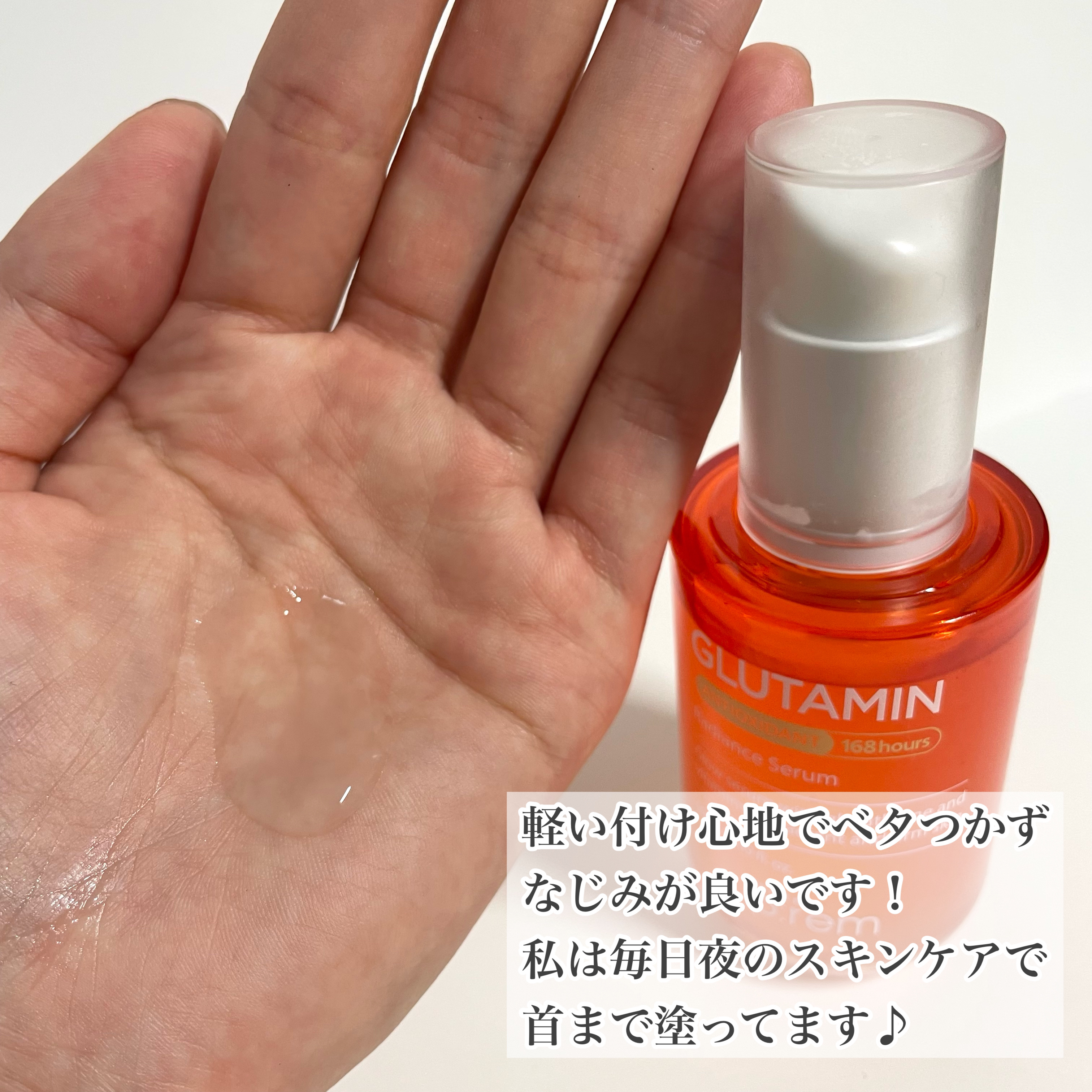 グルタチオン・ビタミン5種・トラネキサム酸を配合した美肌抗酸化ケア美容液🧡 肌のツヤ、肌トーン、弾力、色素沈着にアプローチしてくれるよ👍🏻 抗酸化の核心成分グルタミン™を35.250ppm配合 グルタチオン、ナイアシンアミドをはじめとするビタミン成分がたっぷり✨️ しっとり保湿してもち肌に😌 香りもしないから朝晩使いやすい👍🏻