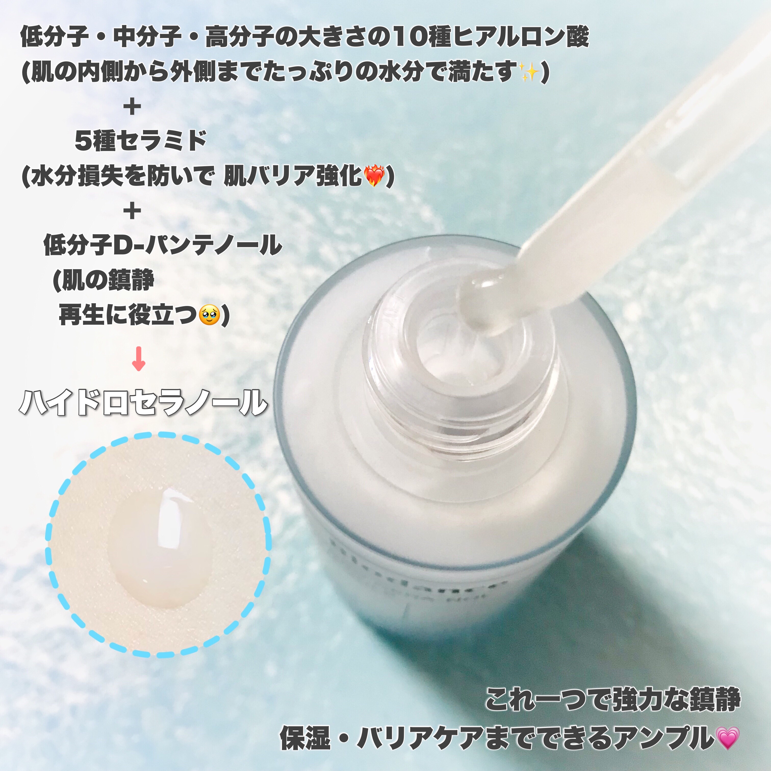 - 5重セラミド*とパンテノール*を配合し、独自開発したセラノール成分*とアルプスで抽出した高純度氷河水*を使用し、肌の整肌や保湿、肌バリアサポートが期待できるアンプル。ベタつかず、しっかり保湿をする半透明のテクスチャー。 *保湿成分