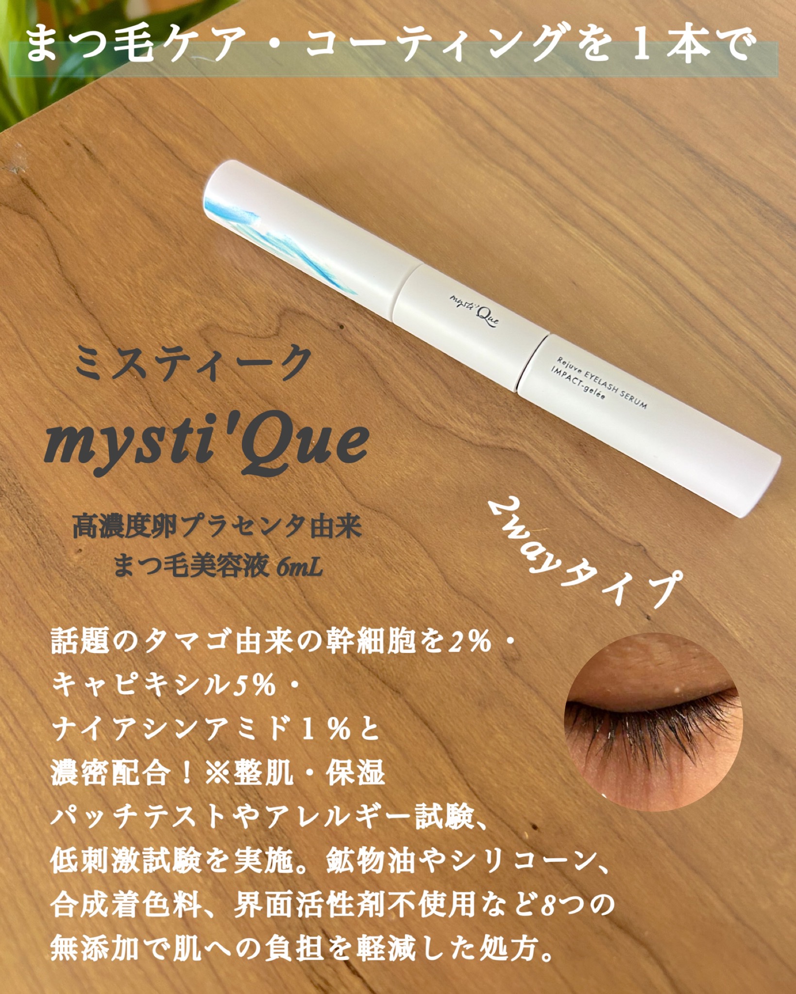 - 塗るまつパ™美容液×まつ毛美容液として、ミスティークブランド第一弾の製品です。メイク感覚で自宅でまつ毛パーマの様な仕上がりを作れるコーム側の美容液と、贅沢な濃密処方のまつ毛美容液を1本で叶えます。