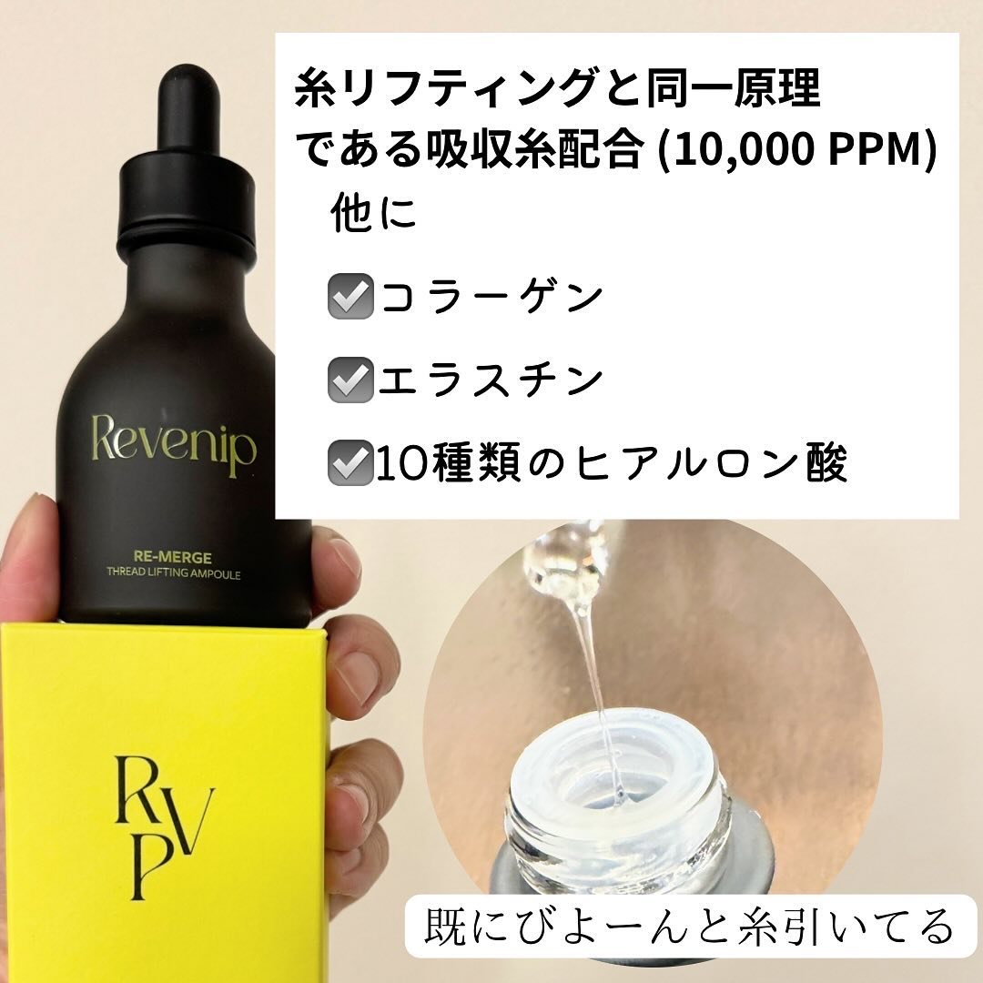 韓国の肌弾力専門ブランド REVENIP(リベニプ)様よりリマージ糸リフティングアンプルをいただきました。リベニプはQoo10へ新しく進出した韓国スキンケアブランド!「崩れない弾力ケア」で肌の黄金期を持続的に維持させるというコンセプトです。 ほのかにフローラルな香りがする透明な美容液です。そしてよくInstagramで見るように糸を引くくらいトロトロなのか……本当にとろっとろ!!とってもお肌に効きそうで魅力的です!