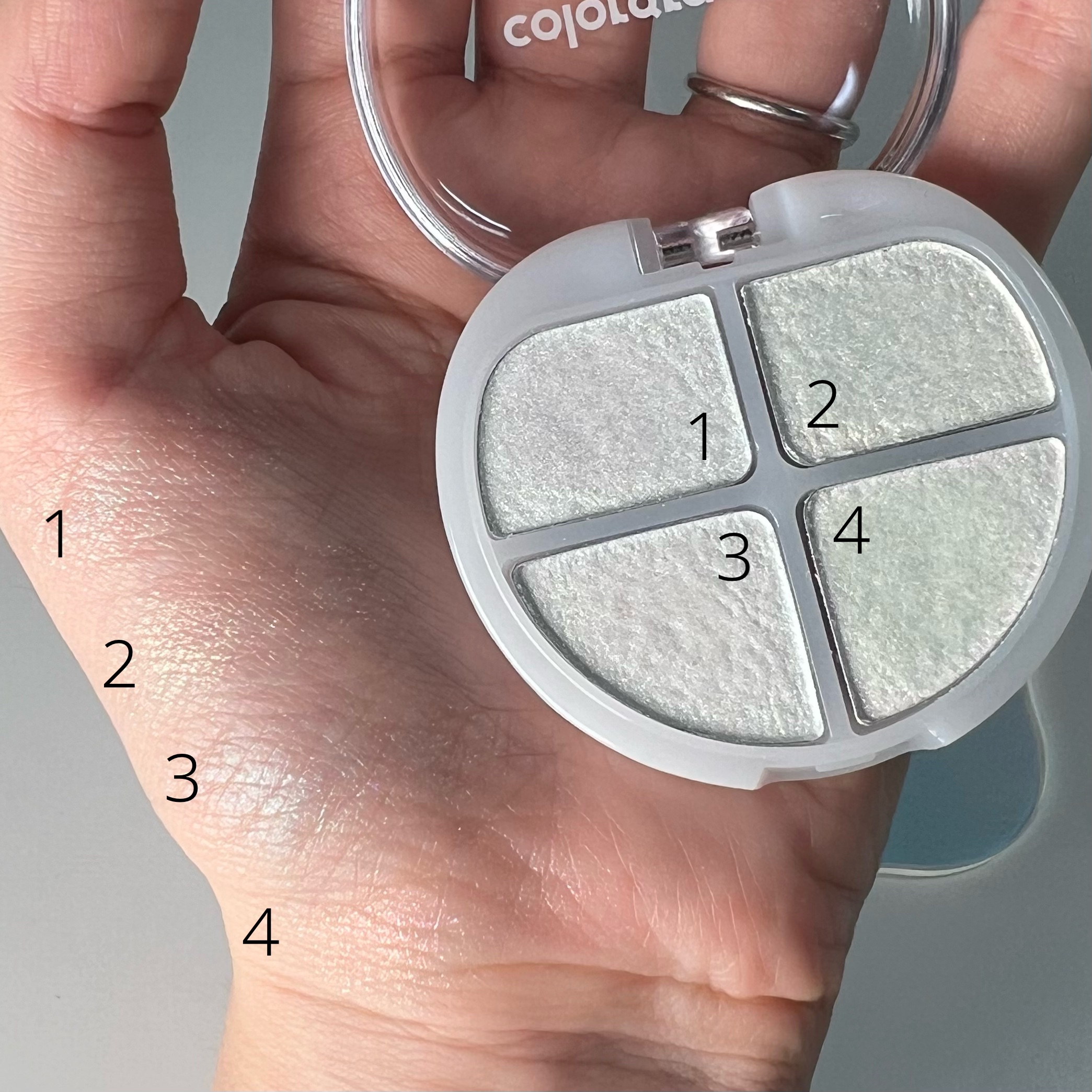 #提供Colorgramティントリーアイパレット01.グリトリーoliveyoung様より頂いたキャンペーンボックスに入っていたパレット✨とっても可愛かった✨一見、全部同じ白いラメ。4つに分けてどーすんの?って思った^^;でも肌にぬると全然...