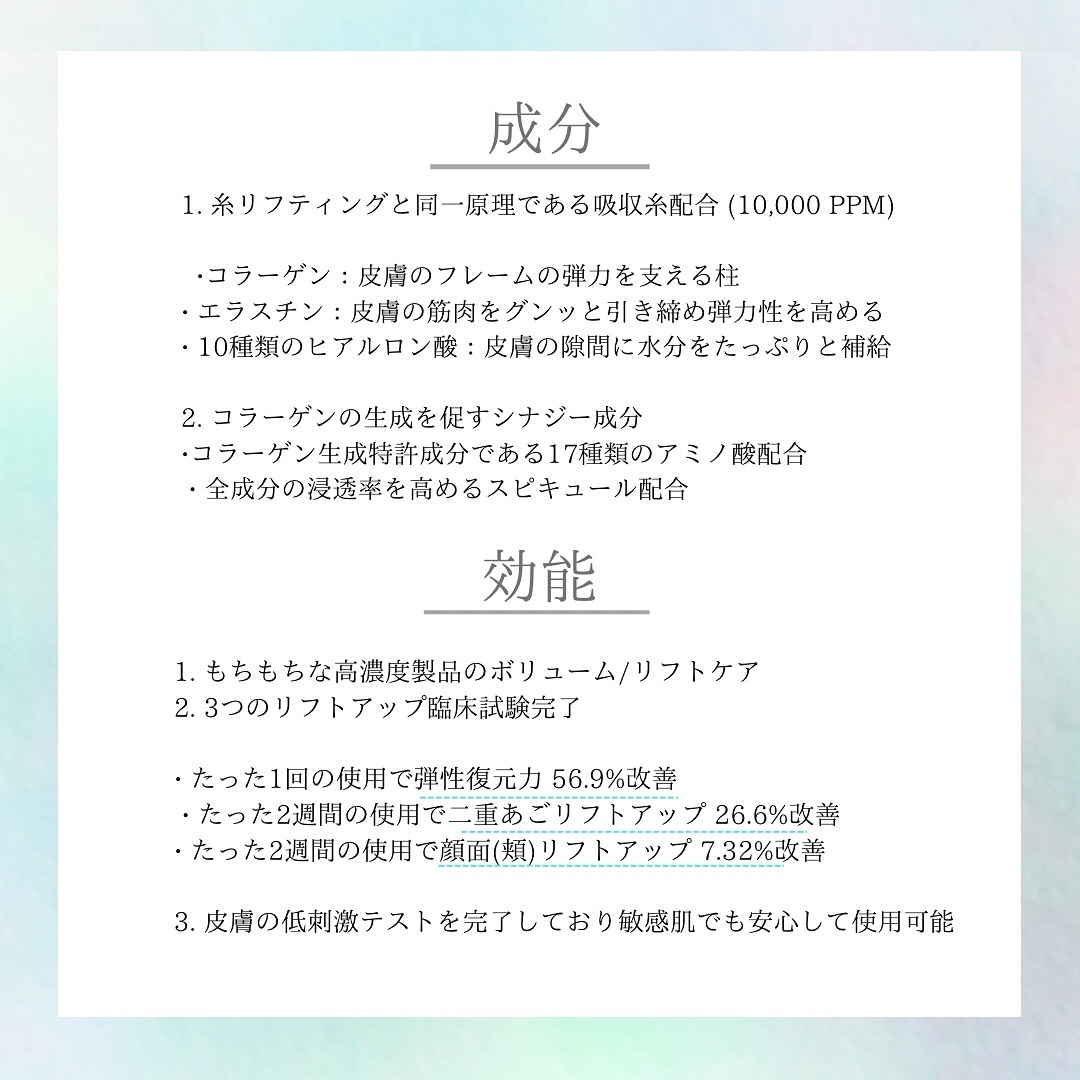 - リマージ糸リフティングアンプルはハリケアを提供する機能性アンプルです。 - 皮膚低刺激テスト試験を完了(全ての方に皮膚刺激が発生しないということではありません) - 10種類のヒアルロン酸*とナイアシンアミド*を含有し、角質層の保湿ケア - コラーゲン*とナイアシンアミド*を肌の角質層へ浸透させる - 高濃度の糸リフティングテクスチャーでベタつかず、しっとりとしたさわやかな仕上がり - 敏感肌でも使用可能 *保湿成分