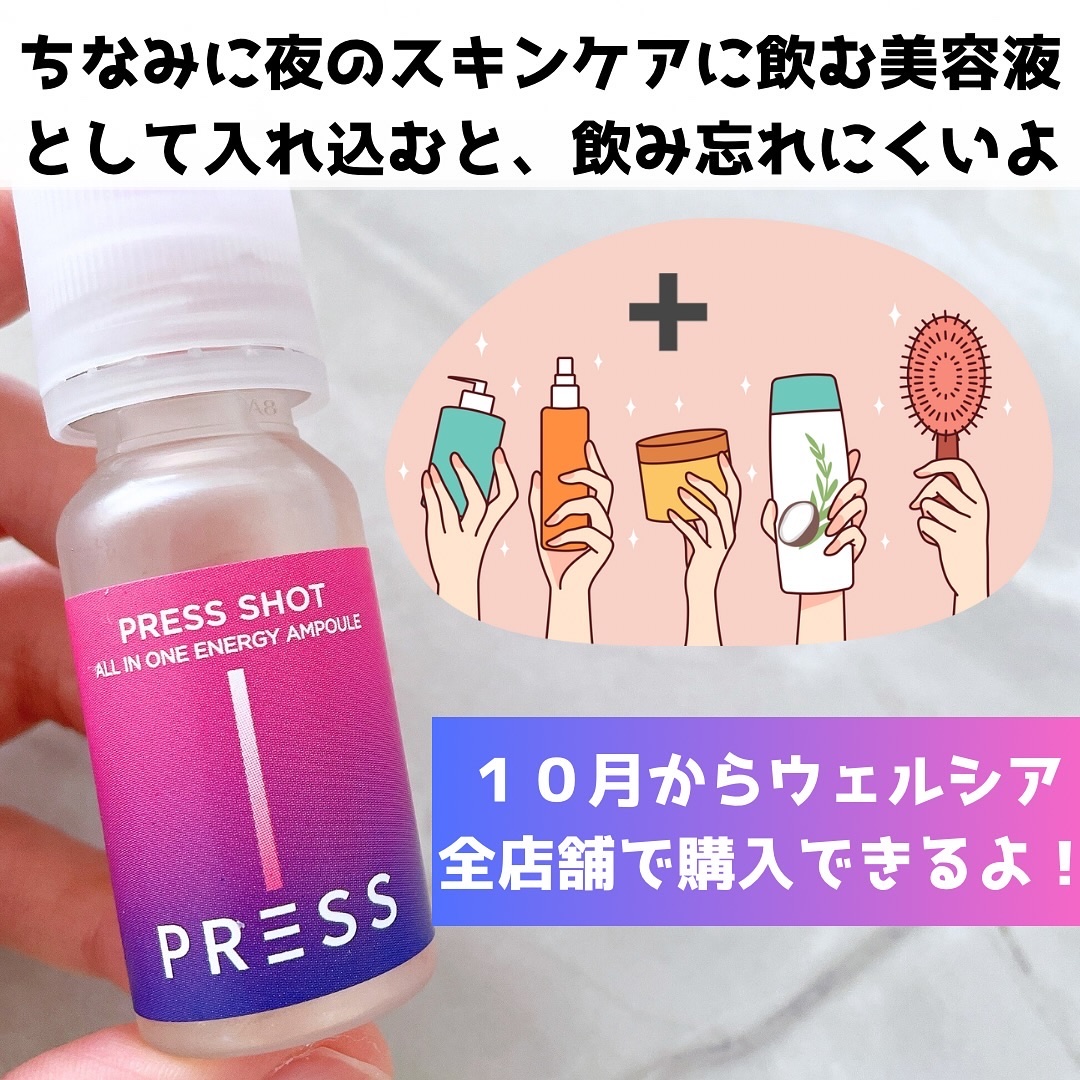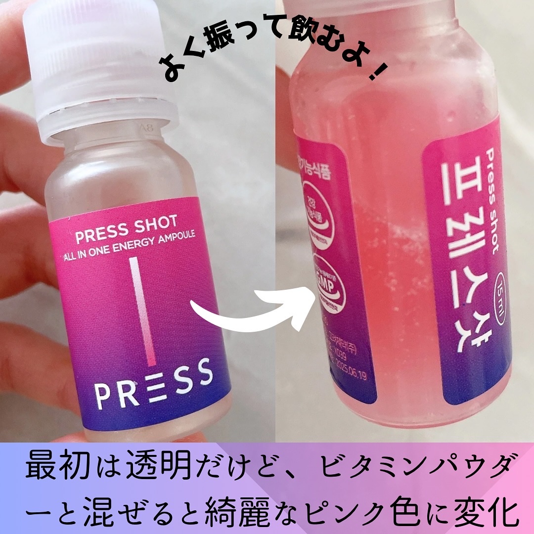- ・PRESSしてSHAKEするだけ!魔法のようなピンクビタミンに! ・飲むインナービューティー ・飲むピンクビタミン ・粉末にはビタミン B12/D/E、葉酸、ナイアシン、亜鉛が含まれています ・吸収力を重視した液状タイプでの商品設計 ・特許取得の特殊キャップにビタミンを真空密封 ・ビタミンB群を集中配合 ・ビタミンB12は1日の基準値に対し16,667%配合 ・液体は11種類のアミノ酸で吸収しやすい設計 ・飲む瞬間にキャップを押す⇒ビタミンが液体に混ざりフレッシュなビタミンドリンクが完成! 【注意事項】 ・高カルシウム血症がある場合、または医薬品を服用されている方は専門家に相談してください。 ・体に異変を感じた場合は使用を中止し、速やかに専門家に相談してください。 ●本品は、多量摂取により疾病が治癒したり、より健康が増進するものではありません。 亜鉛の摂り過ぎは、銅の吸収を阻害するおそれがありますので、過剰摂取にならないよう注意してください。一日の摂取目安量を守ってください。乳幼児・小児は本品の摂取を避けてください。 ●本品は、特定保健用食品と異なり、消費者庁長官による個別審査を受けたものではありません。 ●食生活は、主食、主菜、副菜を基本に、食事のバランスを。 ●本品製造工場では卵、小麦、そば、落花生、えび、かに、くるみを含む製品を製造しています。 ●摂取目安量:1日当たり1本を目安にお飲みください。 ●摂取の方法:キャップを押すと粉末が落ちます。上下に振り、混ぜてからお飲みください。※粉末が固まる場合がございますが、品質には問題ありません。よく振ってからお飲みください。 2024年12月中旬より全国のウエルシア薬局とロフト※にて先行販売をいたします。 ※一部お取り扱いがない店舗がございます。