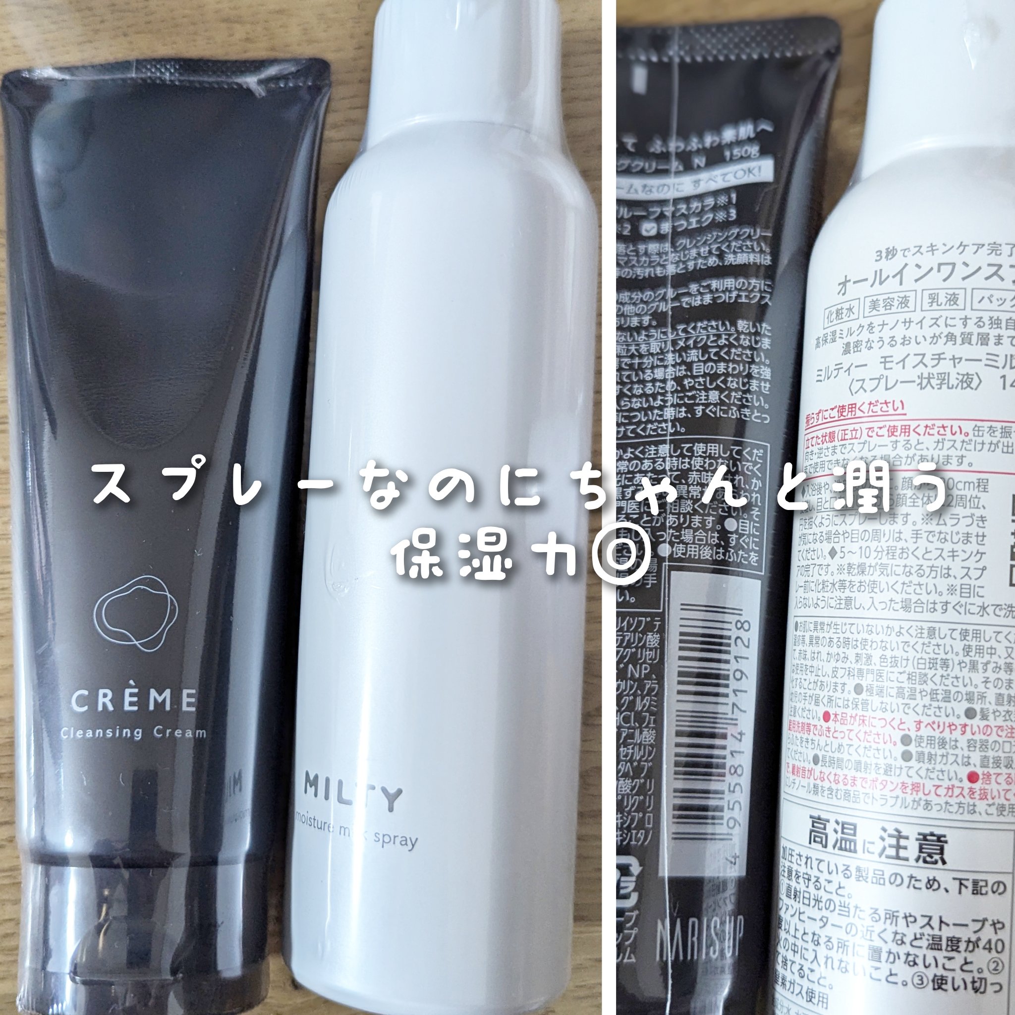 - 日本初*1高保湿ミルクスプレー。洗顔後にスプレーするだけで驚きのしっとり感が続く。 独自処方の乳液をナノ化することでスプレー化に成功。しっかりうるおいを浸透*2×密封。 【化粧水・美容液・シートパック・乳液・クリーム】5つのステップが3秒*3で完結。 10種類の保湿成分配合(ビタミンC誘導体*4・セラミド*5・CICA*6・コラーゲン*7・米発酵液*8・ヒアルロン酸*9・ヨクイニンエキス*10・レチノール・豆乳発酵エキス*11・プラセンタエキス)。 水分と油分が分かれることなく肌に浸透*2するのでしっとりもちもち肌がずっと続く。無香料、無着色、無鉱物オイル、無エチルアルコール。 *1オールインワンコスメにおいて、日本初、そして日本で唯一、窒素ガスを用いた乳液(白濁ミルク)状のオールインワンミスト化粧品(2023年4月7日 TPCマーケティングリサーチ株式会社調べ) *2角質層まで *3スプレーする時間のこと *4リン酸アスコルビルMg *5セラミド3、コレステロール、ステアリン酸 *6ツボクサエキス *7水溶性コラーゲン *8コメ発酵液 *9ヒアルロン酸Na *10ハトムギ種子エキス *11豆乳発酵液