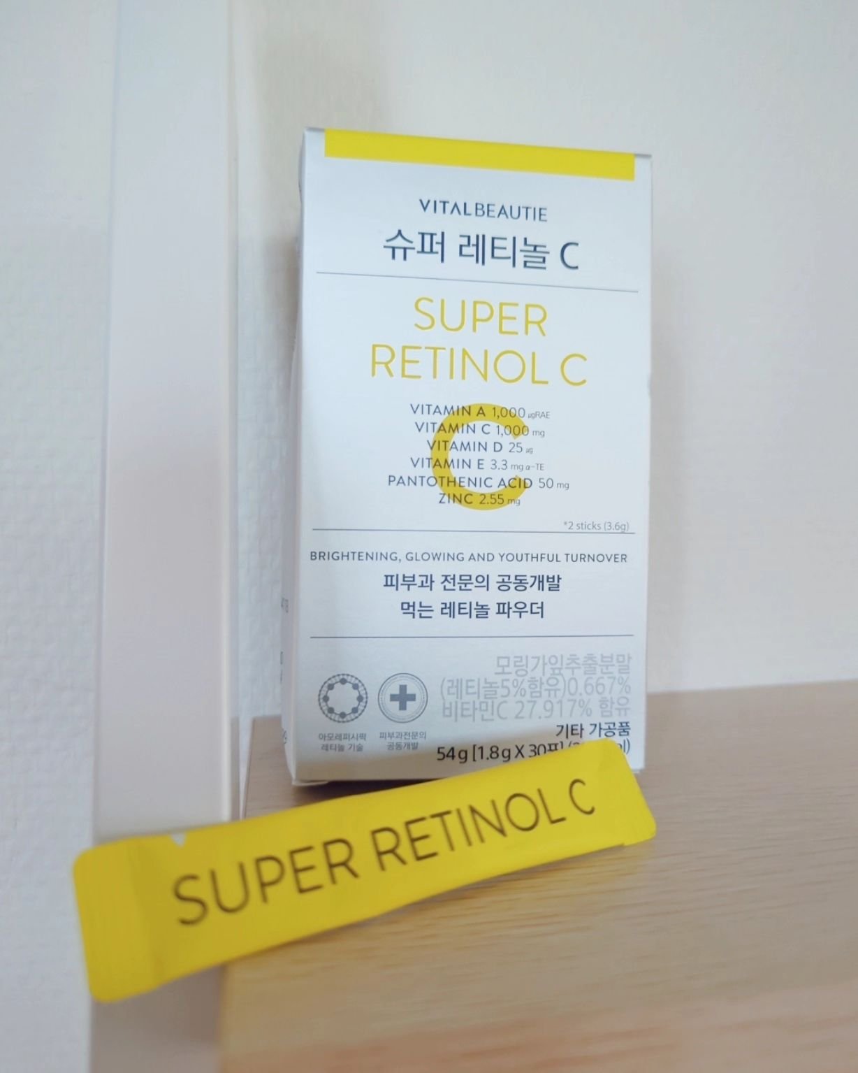 皮膚科専門医とAMORE PACIFICが共同開発 飲むレチノール VITALBEAUTIE SUPER RETINOL C ビタミンC1,000mg* パントテン酸1日の栄養成分基準 1,000%* ビタミンD 、ビタミンE、亜鉛 など配合! 持ち運びのしやすいスティックタイプでいつでもビタミンCをチャージできるのでこれなら手軽に続けられそう