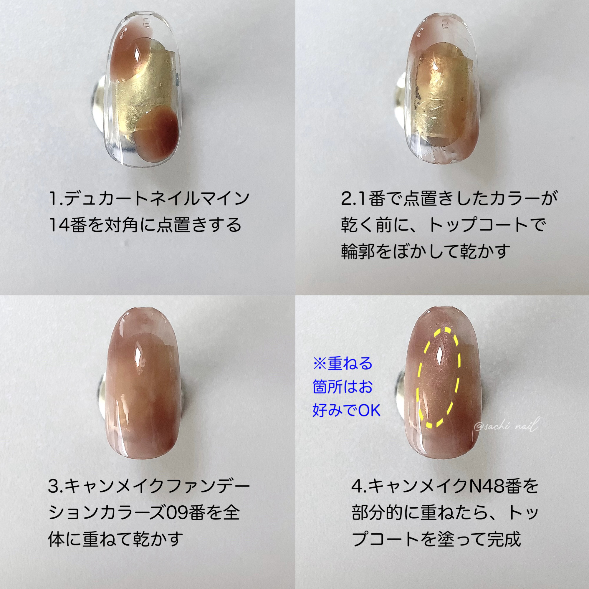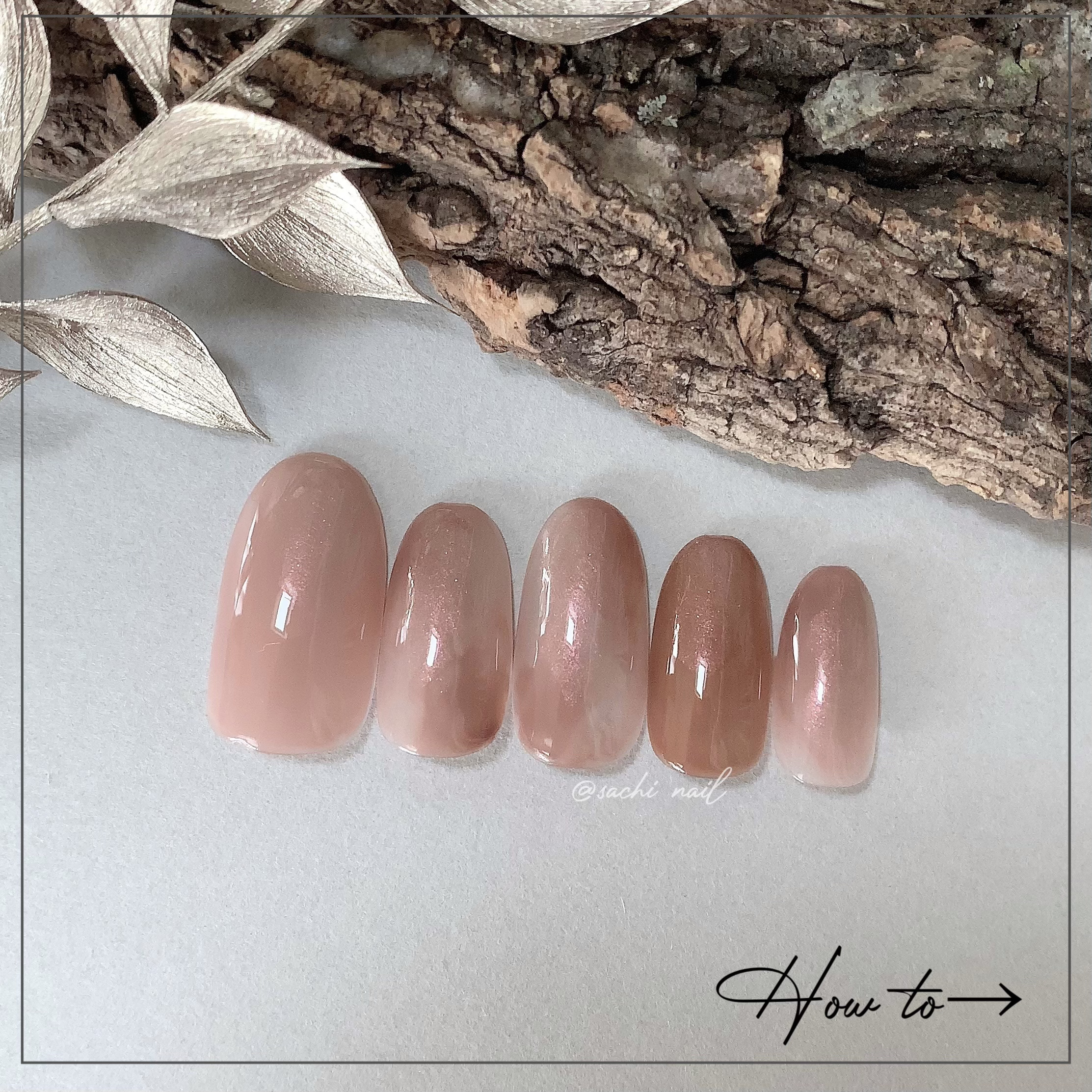 ワンカラーでも指ごとに色を変えるだけでオシャレに見えます💕 画像のようにゴールドラインとストーンを少し足すだけで華やかさがアップ🥰 何度かご紹介したことのあるスポンジで作るグラデーションです✨ スポンジを使うことで境目が綺麗に馴染んでくれます💕 アルミホイルの上でブラウンとトップコートを1:1くらいで混ぜたものを、トップコートのハケに取って3箇所に塗るだけ👌 事前に混ぜたものを塗ることで、爪の上でぼかすより簡単に出来ます💕 ベースカラーが乾く前に点置きしてぼかすことで綺麗にぼかせます✨ スピードが大事なので、使うポリッシュのキャップは全て開けておきましょう😊 天然石のラインはガタガタの方がより天然石っぽく見えるので、ラインを描くのが苦手な方でも大丈夫🙆♀️ 難しそうに見えて、やってみると意外と簡単に出来ます♡