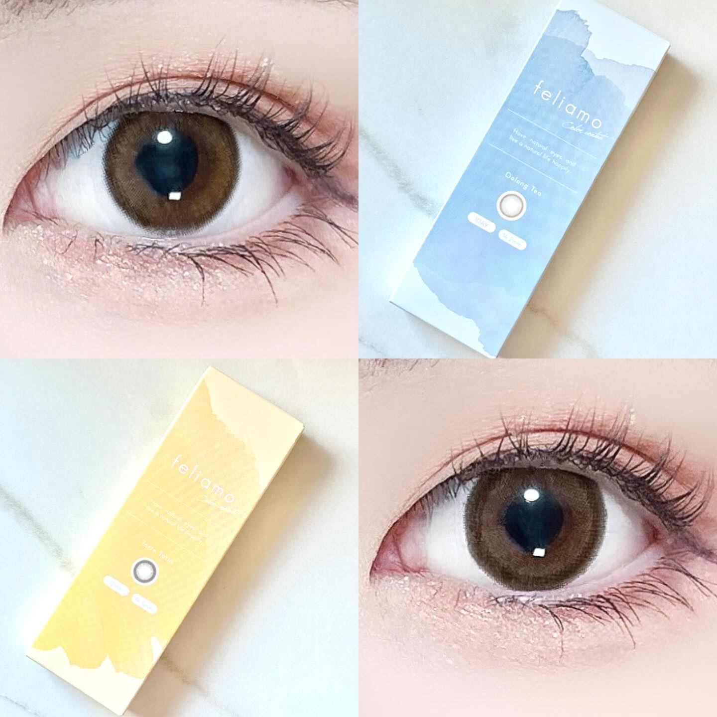 feliamoマンスリーに3つの新色が仲間入りしました! 「ウーロンティー」は、さり気ない細フチと透明感あるブラウンが瞳を綺麗に見せる裸眼風カラー🫖 「タルトタタン」は、くっきり太フチとツヤっぽブラウンがうるっとドーリーな瞳に見せるデザイン🫶🏻 「ティラミスリング」は、ふわっと発色のぼかしフチがナチュラルに瞳を強調するあざとブラウンカラー🤍