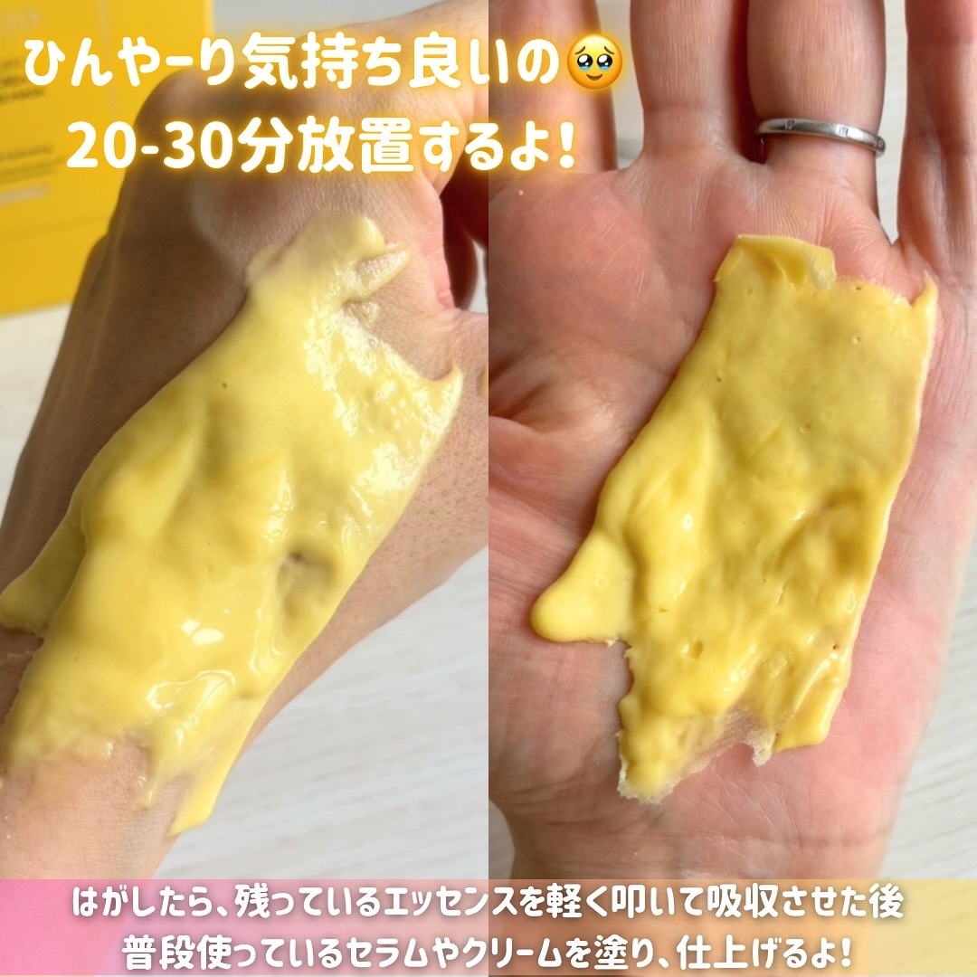 冷たいビタミンセラムの隙間なく肌に密着するモデリングマスク💛 クリームベースの液体が不必要な角質と老廃物を吸着し、水分を肌に届け涼しくクーリングケアしてくれる🥣 時間が経ってもぷるっぷる!! 剥がした後も水分が肌に行き届いてたよぉ😳🤍 簡単にスペシャルホームケアができちゃうから今度友人にエステ気分でやらせてもらおうかな?💓