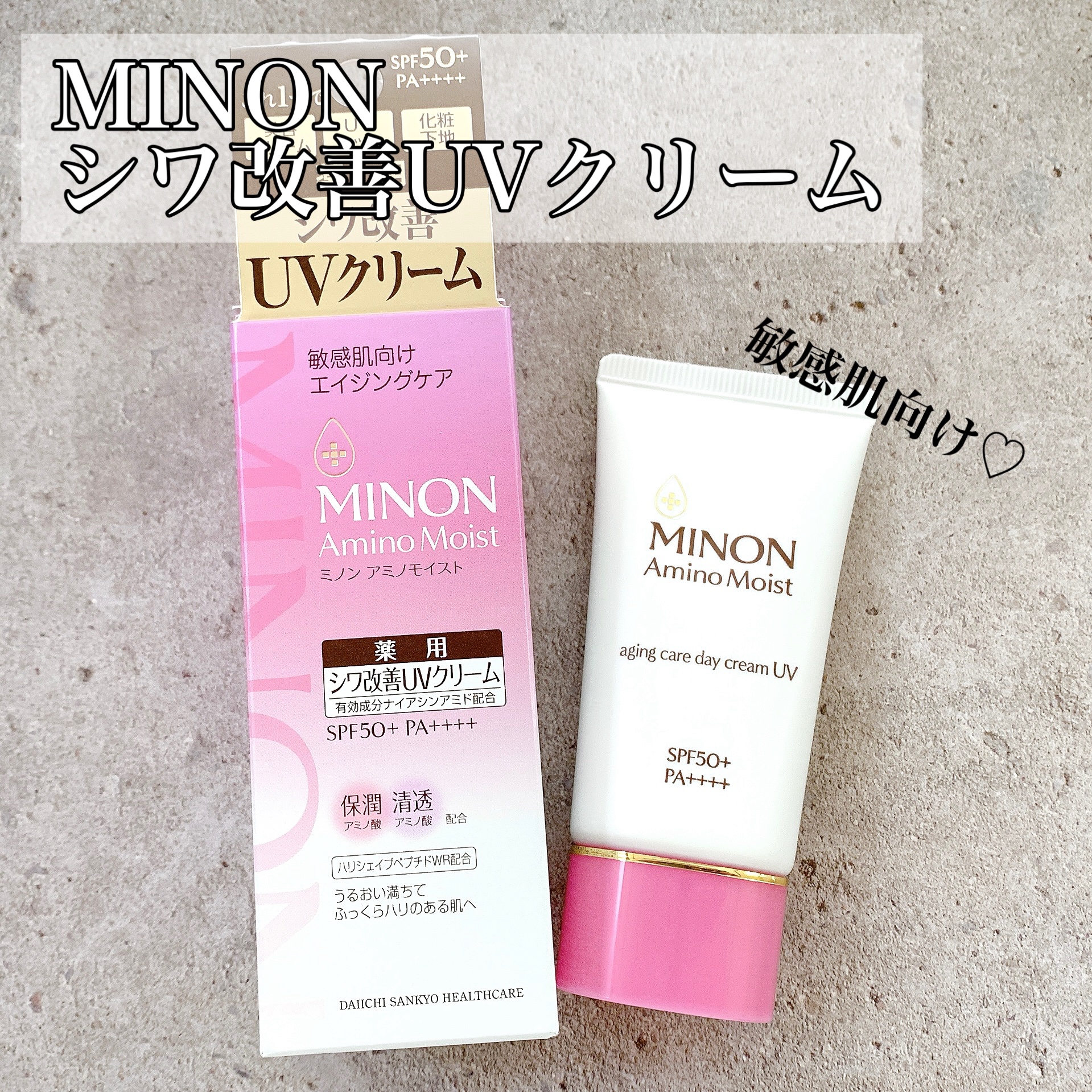 - 【シワ改善もできるUVクリーム】 SPF50+PA++++ シワ改善×UVカットが出来る薬用シワ改善UVクリーム。これ1本で美容クリーム・UVカット・化粧下地の3役。 シワ改善&しみ*予防成分「ナイアシンアミド」、肌あれ予防成分「グリチルリチン酸2K」配合。紫外線吸収剤&酸化亜鉛フリーで敏感肌を考えた処方。自然な輝きを放つ、やわらかなテクスチャーの化粧下地、見る角度で反射色が変わる「艶肌ダブルカラーパウダー」配合で自然な立体感を演出。 エイジングケア:年齢に応じたお手入れケア *メラニンの生成を抑え、しみ・そばかすを防ぐ (販売名:ミノンアミノモイストAU)【医薬部外品】