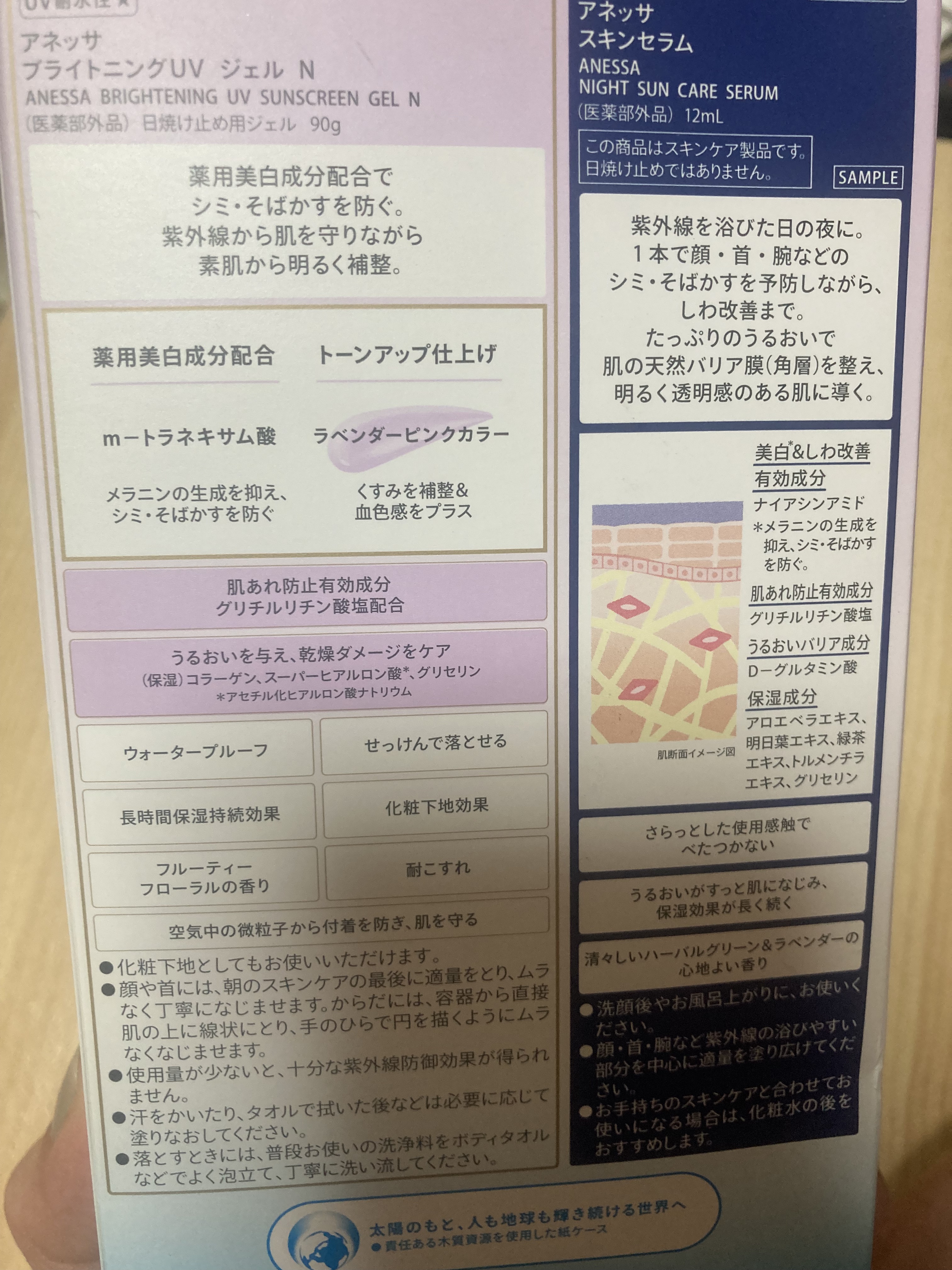 - 〈数量限定〉24時間UVケアを体感 日中、トーンアップ仕上げで素肌から明るく補整する薬用ブライトニングUVジェルにうるおい・美白の夜のUVケア(特製サイズ)付きのセット 【セット内容】 ・アネッサ ブライトニングUV ジェル N(医薬部外品) 顔・からだ用 SPF50+・PA++++ UV耐水性★ 90g ・アネッサ スキンセラム(医薬部外品) <美容液> 顔・からだ用 12mL(特製サイズ)