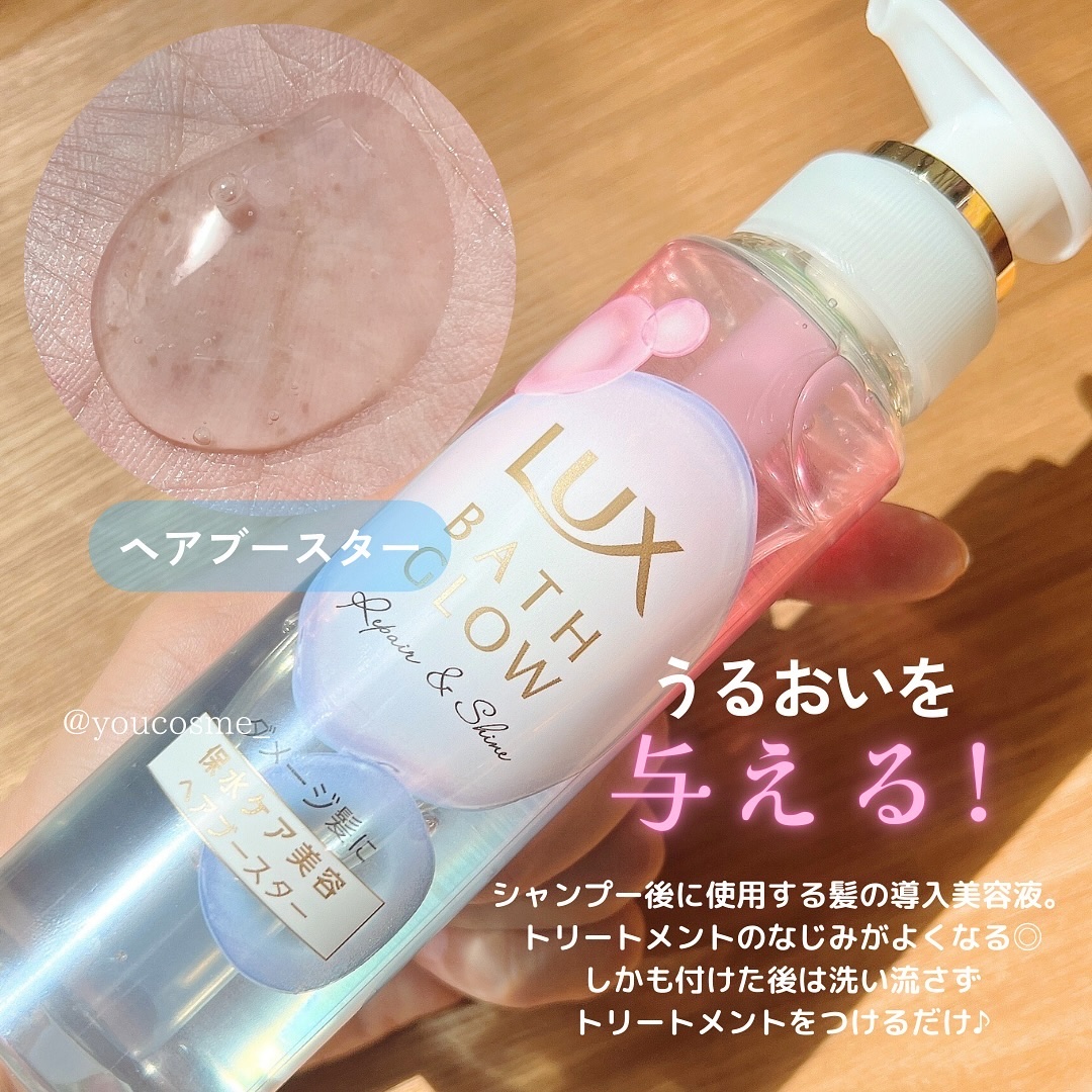 - ラックスバスグロウシリーズからリペア&シャインとストレート&シャインが登場。髪内部にとどまり、髪の内部までうるおいをチャージする保湿成分“ぷるぷる浸透ウォーターゼリー”が髪の芯まで集中補修してくれます。 また髪の導入美容液であるヘアブースターが新登場。シャンプー後のキューティクルが開いているヘアケアのゴールデンタイムに使用することでうるおいを補給、トリートメントが髪にたっぷり馴染むようになります。しかも付けた後に洗い流さず、トリートメントを付けるだけだから時間が無い方にもおすすめです!