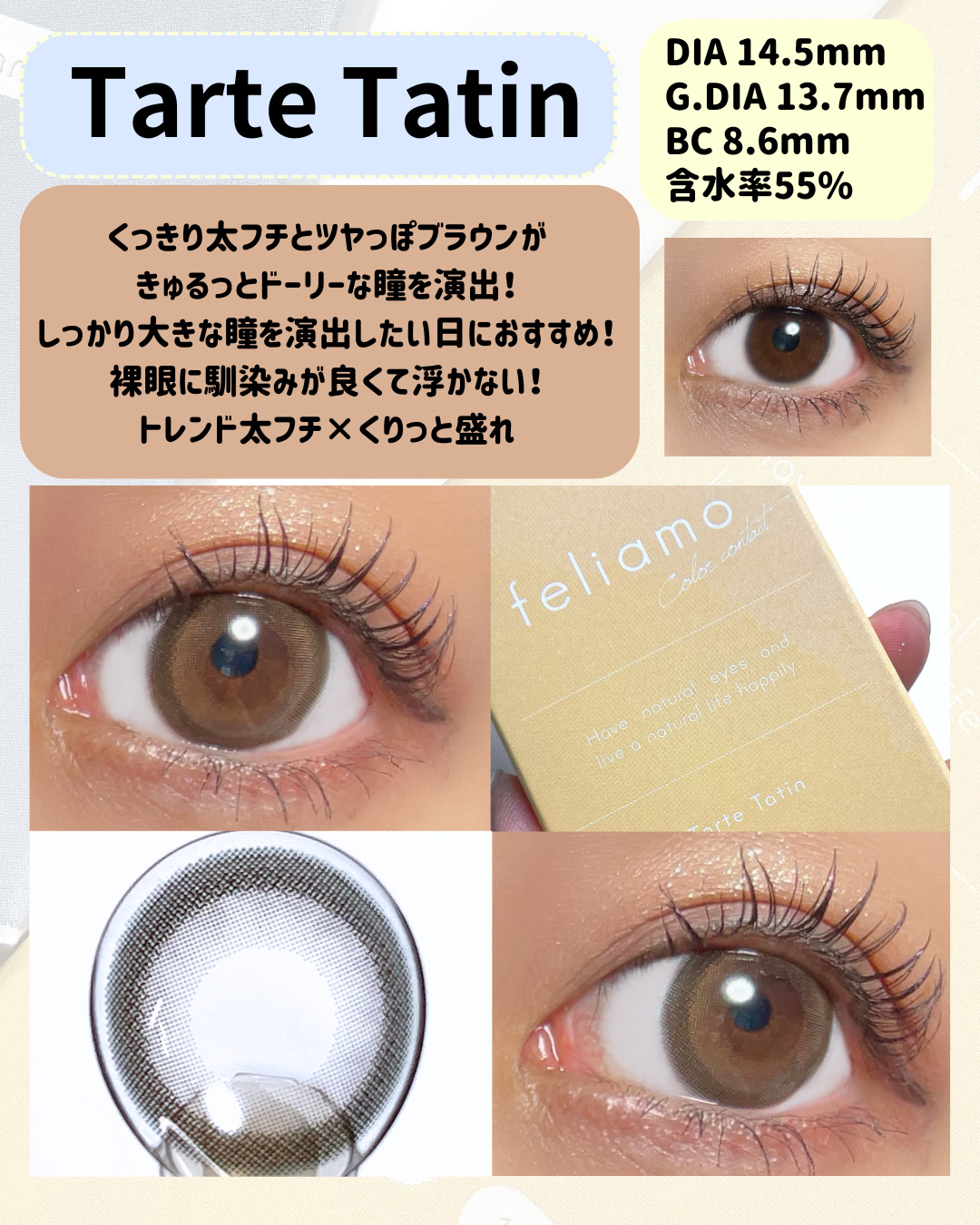 - ※2025年6月以降、商品パッケージ裏面・側面の一部表記を順次変更いたします。尚、これにかかる商品の交換・返品は承っておりません。 どんな瞬間にも溶け込む誰からも愛される瞳へ feliamoの由来は felice amore~幸せな愛~ 瞳から愛されオーラを放つ好印象レンズで女性らしさと品を演出。 オンも、オフも、特別な日も。 どんな場面にも溶け込むレンズラインナップで誰からも愛される瞳に。 UV CUT Feature1 肌や瞳に有害といわれ、白内障などの眼病を引き起こす危険性のある紫外線を99%カットします。(UV-A波75%、UV-B波99%カット) イオン性 Feature1 水分を多く含み酸素を通しやすいため瞳にやさしい使い心地で、快適な装用感です。 高含水 Feature1 水分が多く含むやわらかい素材で、快適なつけ心地です。 レンズ構造 Feature1 まぶた側に着色剤を内包しているため、角膜に色素が触れることがない構造を採用しています。 レンズ形状 Feature1 フチを丸みのある形状にすることで自然な装用感を実現しました。 ※装用感には個人差があります。 カラーコンタクトレンズの不適正使用による眼障害の危険性等などがあります。 ●コンタクトレンズは高度管理医療機器です。不十分な洗浄・消毒など不適切なケアや、長時間・交換期間を超えた装用により、アレルギー性結膜炎、角膜感染症、角膜潰瘍等の重篤な眼障害が発生する危険性があります ●ご使用前に取扱説明書を確認してください 使用上の留意事項 ●眼科医院等を受診してからお求めください ●眼に異常を感じたら直ちにレンズ使用を中止し、お近くの眼科等で診察を受けてください ●医師の指示にしたがってご使用ください ●コンタクトレンズを装用する場合、自覚症状がなくても、眼科医院等での定期検査を受けてください ●レンズに不具合がある場合は使用しないでください