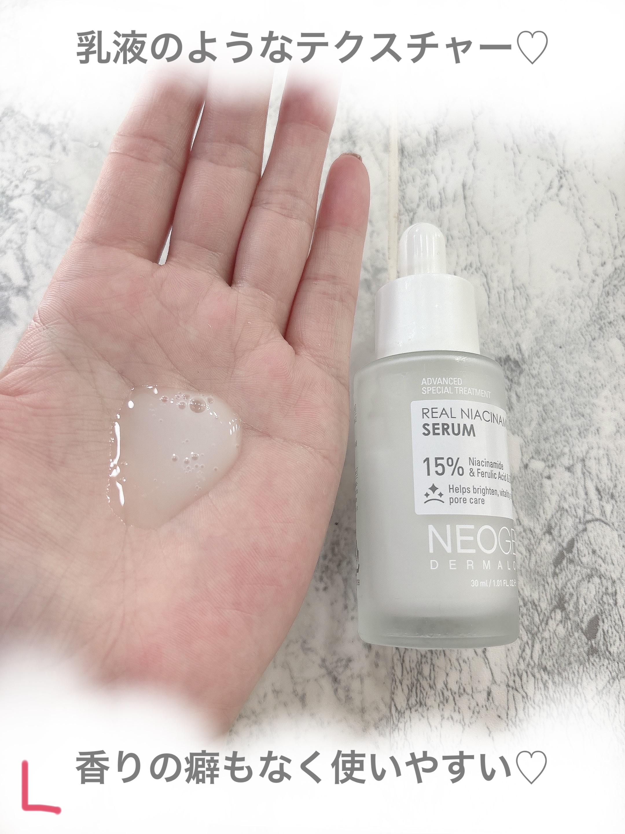 NEOGENリアルナイアシンアミドセラム保湿・ハリ感・ゆらぎ・肌トーンなど1本でさまざまな肌悩みにアプローチしてくれるNEOGENの万能セラム💭ˊ˗ナイアシンアミド15%配合の他にフェルラ酸やα-ビサボロールも配合🌿乳白色の少しトロッとしたテ...