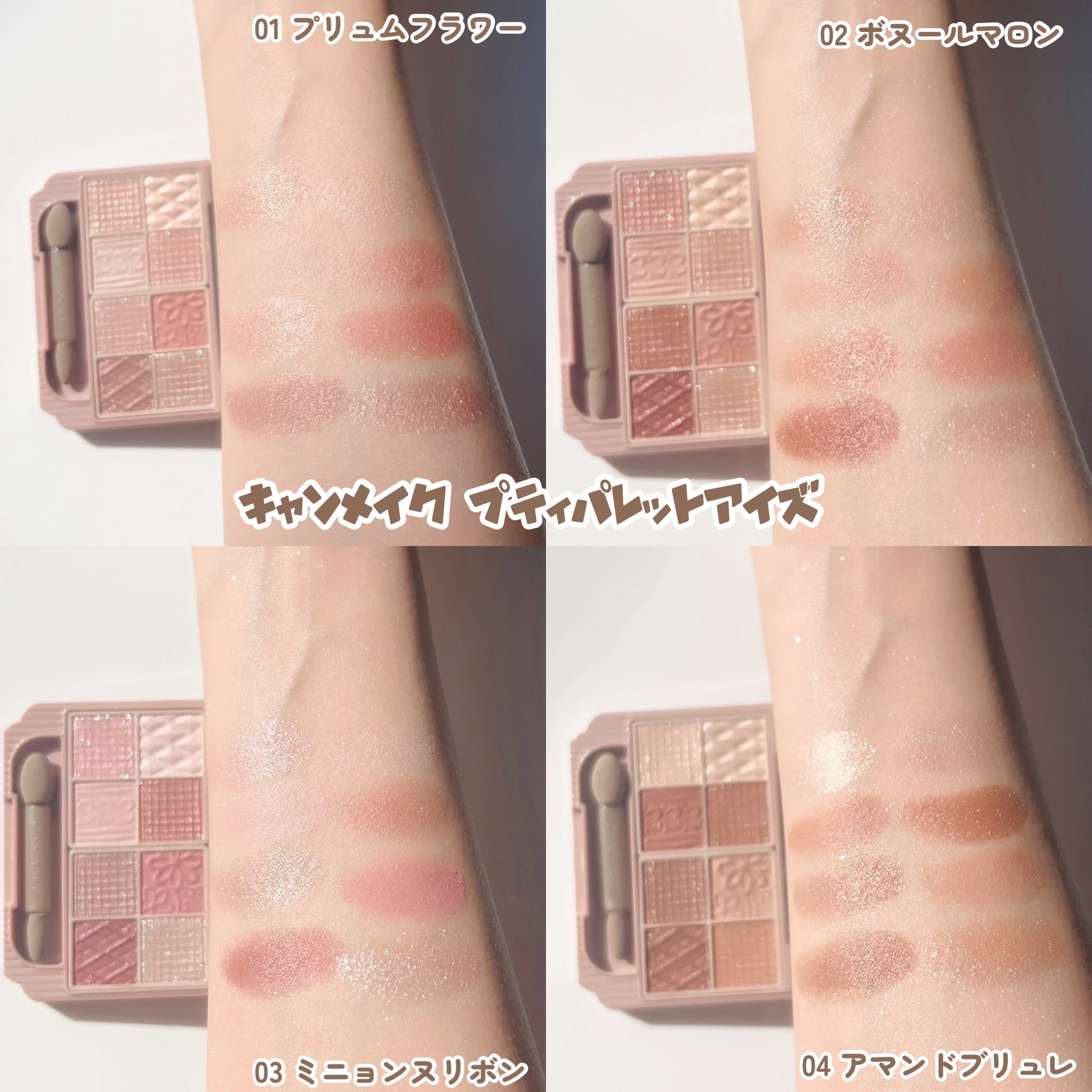 キャンメイクのプティパレットアイズを全色スウォッチしました🙌🏻 イエベ春(2nd夏)さんにおすすめ ✔︎01プリュムフラワー ✔︎M03 ミルキーチェリコッタ(ニュートラル) ブルベ冬さんにおすすめ ✔︎03 ミニョンヌリボン(濃い色を使う) ✔︎M02 ロマンティックフォグ