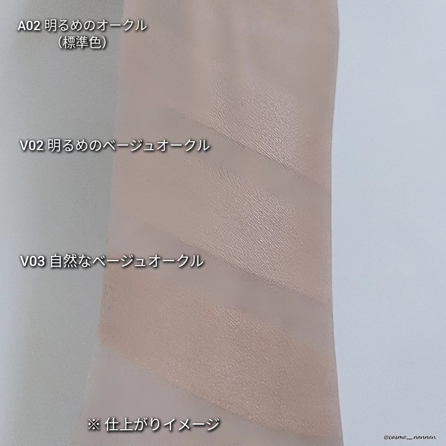 - <A02 明るいオークル(標準色)> 水、酸化チタン、メチルトリメチコン、シクロペンタシロキサン、メトキシケイヒ酸エチルヘキシル、カプリリルメチコン、PEG-10ジメチコン、プロパンジオール、フェニルベンズイミダゾールスルホン酸、トリメチルシロキシケイ酸、ポリメタクリル酸メチル、シクロヘキサシロキサン、ナイアシンアミド、合成フルオロフロゴパイト、トロメタミン、ナイロン-12、酸化鉄、1,2-ヘキサンジオール、ラウリルPEG-9ポリジメチルシロキシエチルジメチコン、ジステアルジモニウムヘクトライト、パンテノール、塩化Na、ステアリン酸亜鉛、水酸化Al、ニンフェアケルレア花水、ポリプロピルシルセスキオキサン、ステアリン酸、(アクリレーツ/アクリル酸エチルヘキシル/メタクリル酸ジメチコン)コポリマー、ジステアリルジモニウムクロリド、パルミトイルプロリン、(アクリレーツ/ジメチコン)コポリマー、パルミチン酸、香料、パルミトイルグルタミン酸Mg、パルミトイルサルコシンNa、ミリスチン酸Al、アデノシン、トリエトキシカプリリルシラン、スクワラン、トコフェロール、クレアチン、尿素、フルクトース、グルコース、アラニン、トレオニン、グリシン、グルタミン、ヒスチジン、グルタミン酸、塩化Ca、アスパラギン、塩化Mg、ウシ血清アルブミン <V02 明るいベージュオークル> 水、酸化チタン、メチルトリメチコン、シクロペンタシロキサン、メトキシケイヒ酸エチルヘキシル、カプリリルメチコン、PEG-10ジメチコン、プロパンジオール、フェニルベンズイミダゾールスルホン酸、トリメチルシロキシケイ酸、ポリメタクリル酸メチル、シクロヘキサシロキサン、ナイアシンアミド、合成フルオロフロゴパイト、トロメタミン、ナイロン-12、酸化鉄、1,2-ヘキサンジオール、ラウリルPEG-9ポリジメチルシロキシエチルジメチコン、ジステアルジモニウムヘクトライト、パンテノール、塩化Na、ステアリン酸亜鉛、水酸化Al、ニンフェアケルレア花水、ポリプロピルシルセスキオキサン、ステアリン酸、(アクリレーツ/アクリル酸エチルヘキシル/メタクリル酸ジメチコン)コポリマー、ジステアリルジモニウムクロリド、パルミトイルプロリン、(アクリレーツ/ジメチコン)コポリマー、パルミチン酸、香料、パルミトイルグルタミン酸Mg、パルミトイルサルコシンNa、ミリスチン酸Al、アデノシン、トリエトキシカプリリルシラン、スクワラン、トコフェロール、クレアチン、尿素、フルクトース、グルコース、アラニン、トレオニン、グリシン、グルタミン、ヒスチジン、グルタミン酸、塩化Ca、アスパラギン、塩化Mg、ウシ血清アルブミン <V03 自然なベージュオークル> 水、酸化チタン、メチルトリメチコン、シクロペンタシロキサン、メトキシケイヒ酸エチルヘキシル、カプリリルメチコン、PEG-10ジメチコン、プロパンジオール、フェニルベンズイミダゾールスルホン酸、トリメチルシロキシケイ酸、ポリメタクリル酸メチル、シクロヘキサシロキサン、ナイアシンアミド、合成フルオロフロゴパイト、トロメタミン、ナイロン-12、酸化鉄、1,2-ヘキサンジオール、ラウリルPEG-9ポリジメチルシロキシエチルジメチコン、ジステアルジモニウムヘクトライト、パンテノール、塩化Na、ステアリン酸亜鉛、水酸化Al、ニンフェアケルレア花水、ポリプロピルシルセスキオキサン、ステアリン酸、(アクリレーツ/アクリル酸エチルヘキシル/メタクリル酸ジメチコン)コポリマー、ジステアリルジモニウムクロリド、パルミトイルプロリン、(アクリレーツ/ジメチコン)コポリマー、パルミチン酸、香料、パルミトイルグルタミン酸Mg、パルミトイルサルコシンNa、ミリスチン酸Al、アデノシン、トリエトキシカプリリルシラン、スクワラン、トコフェロール、クレアチン、尿素、フルクトース、グルコース、アラニン、トレオニン、グリシン、グルタミン、ヒスチジン、グルタミン酸、塩化Ca、アスパラギン、塩化Mg、ウシ血清アルブミン