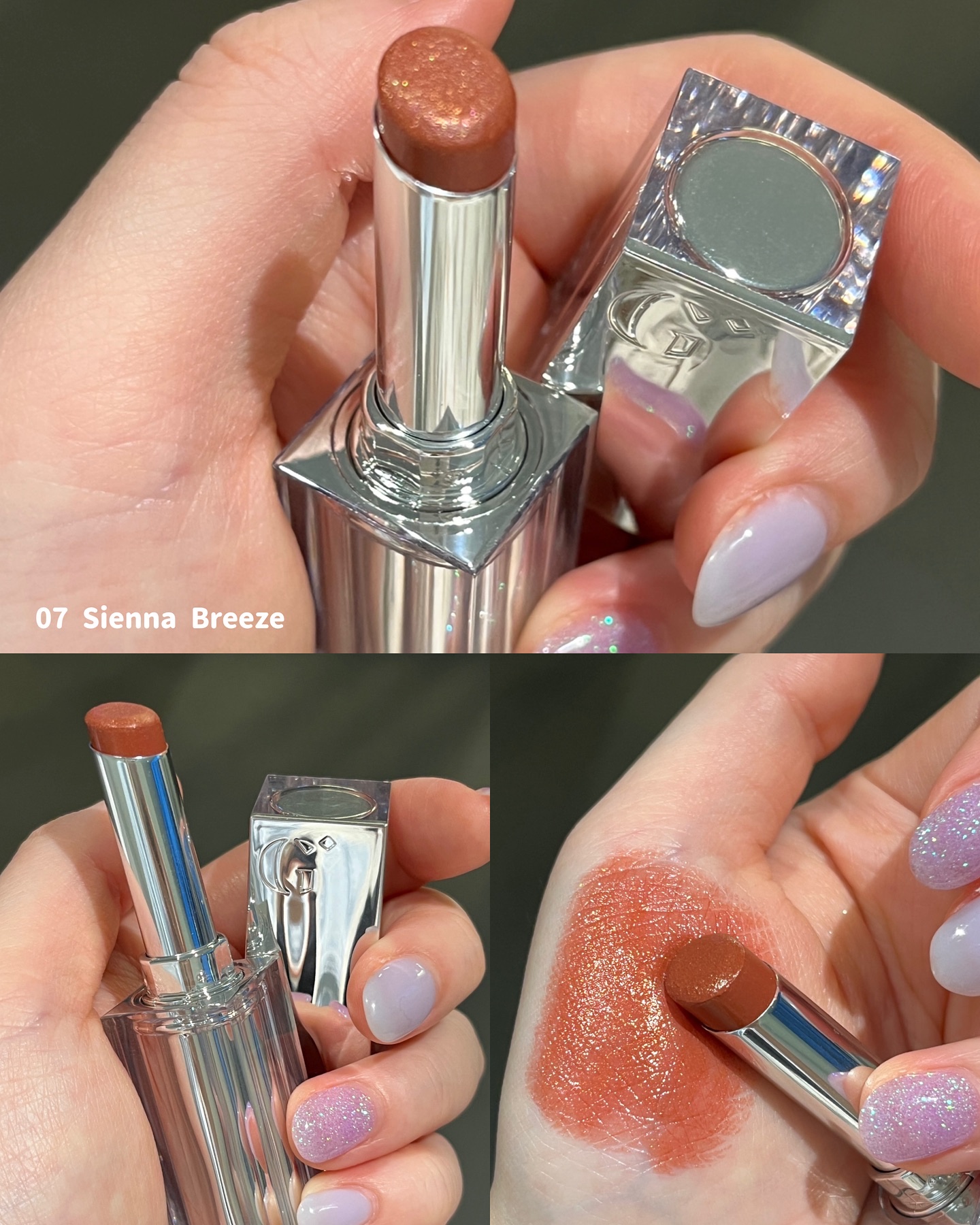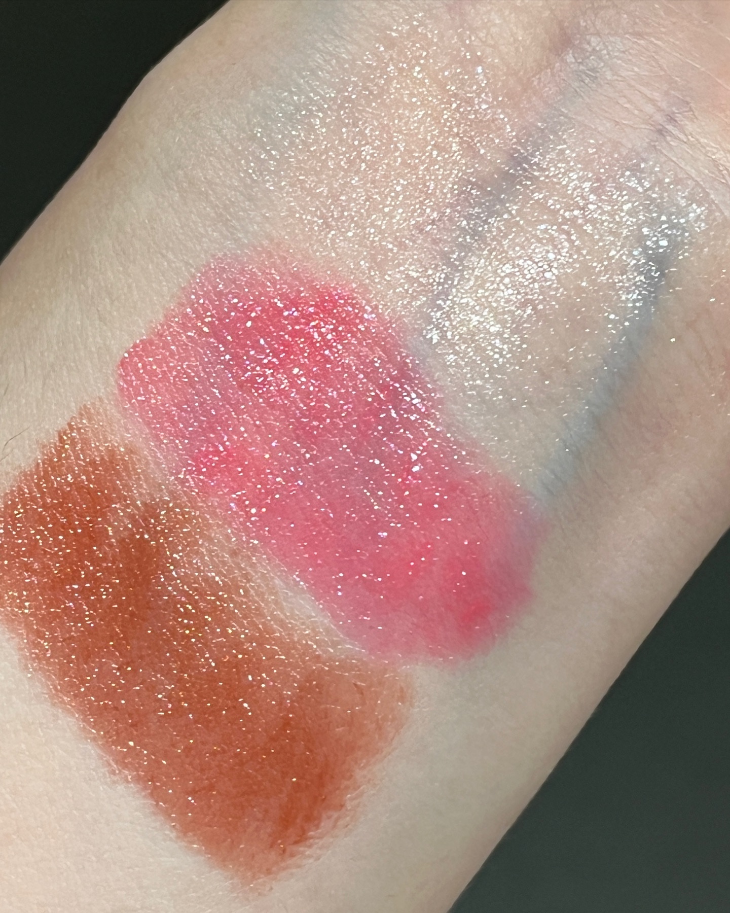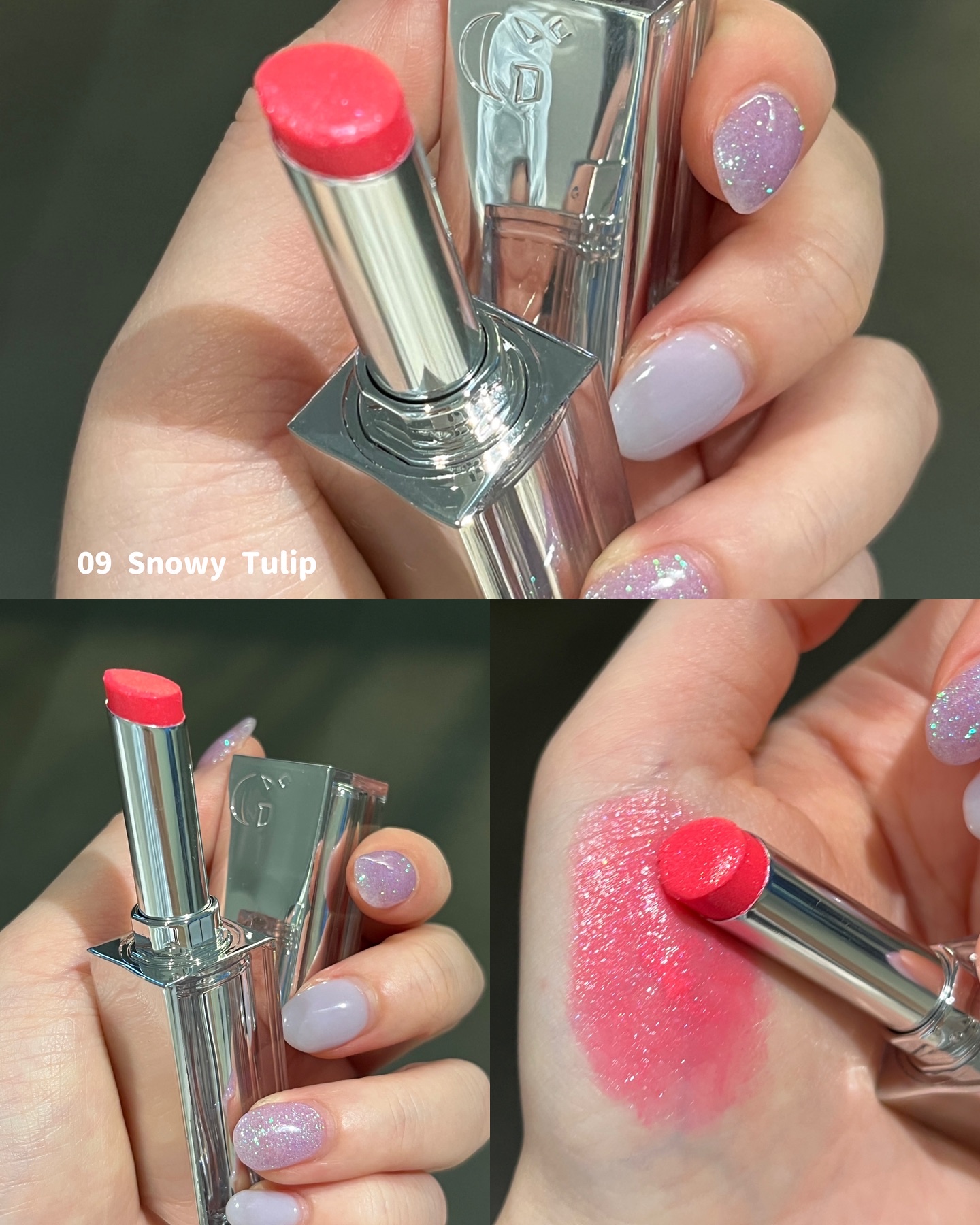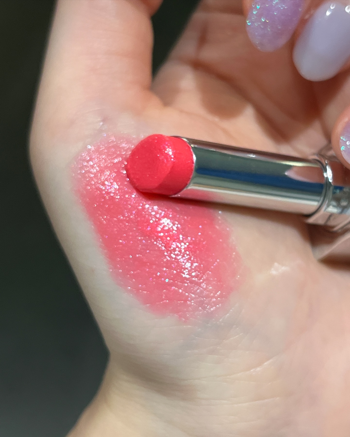 しっとり滑らかな塗り心地でリップバームなので保湿も◎ 持続性はないものの発色抜群で一気に華やかな顔にしてくれるよ🤲 透け感のあるピンクコーラルで3つの中で1番使いやすいカラー🧡 難しいカラーと思ってたけど偏光ラメ?っぽいのが入っててめちゃくちゃ可愛かった😍1番のお気に入りー!!