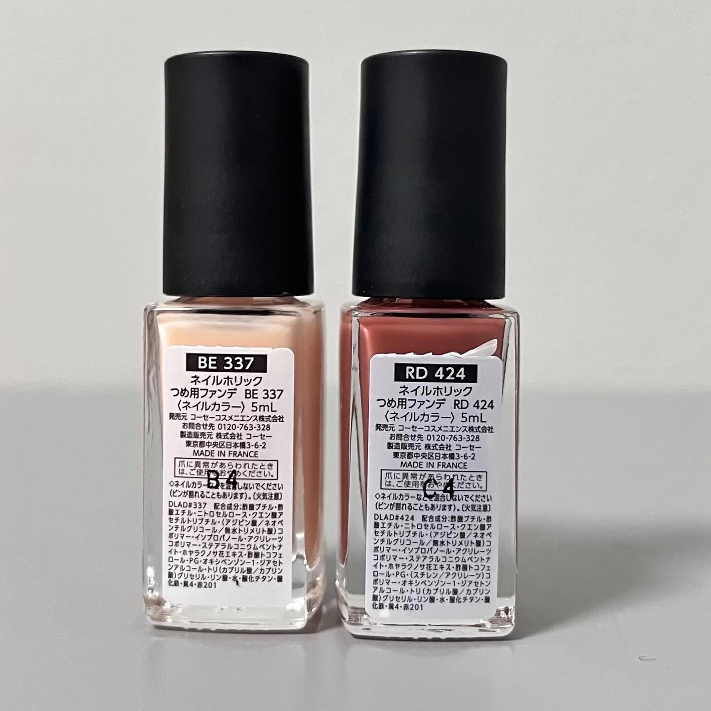 - <BE334 ナチュラルベージュ> 酢酸ブチル、酢酸エチル、ニトロセルロース、クエン酸アセチルトリブチル、(アジピン酸/ネオペンチルグリコール/無水トリメリト酸)コポリマー、イソプロパノール、アクリレーツコポリマー、ステアラルコニウムベントナイト、ホヤラクノサ花エキス、酢酸トコフェロール、PG、(スチレン/アクリレーツ)コポリマー、オキシベンゾン-1、ジアセトンアルコール、トリ(カプリル酸/カプリン酸)グリセリル、リン酸、水、カーボンブラック、酸化チタン、酸化鉄、黄4、赤201 <BE335 ヌードベージュ> 酢酸ブチル、酢酸エチル、ニトロセルロース、クエン酸アセチルトリブチル、(アジピン酸/ネオペンチルグリコール/無水トリメリト酸)コポリマー、イソプロパノール、アクリレーツコポリマー、ステアラルコニウムベントナイト、ホヤラクノサ花エキス、酢酸トコフェロール、PG、(スチレン/アクリレーツ)コポリマー、オキシベンゾン-1、ジアセトンアルコール、トリ(カプリル酸/カプリン酸)グリセリル、リン酸、水、酸化チタン、酸化鉄、黄4、赤201 <BE337> 酢酸ブチル、酢酸エチル、ニトロセルロース、クエン酸アセチルトリブチル、(アジピン酸/ネオペンチルグリコール/無水トリメリト酸)コポリマー、イソプロパノール、アクリレーツコポリマー、ステアラルコニウムベントナイト、ホヤラクノサ花エキス、酢酸トコフェロール、PG、オキシベンゾン-1、ジアセトンアルコール、トリ(カプリル酸/カプリン酸)グリセリル、リン酸、水、酸化チタン、酸化鉄、黄4、赤201 <PK839 ピンクベージュ> 酢酸ブチル、酢酸エチル、ニトロセルロース、クエン酸アセチルトリブチル、(アジピン酸/ネオペンチルグリコール/無水トリメリト酸)コポリマー、イソプロパノール、アクリレーツコポリマー、ステアラルコニウムベントナイト、ホヤラクノサ花エキス、酢酸トコフェロール、PG、(スチレン/アクリレーツ)コポリマー、オキシベンゾン-1、ジアセトンアルコール、トリ(カプリル酸/カプリン酸)グリセリル、リン酸、水、酸化チタン、酸化鉄、黄4、赤201 <PK859> 酢酸ブチル、酢酸エチル、ニトロセルロース、クエン酸アセチルトリブチル、(アジピン酸/ネオペンチルグリコール/無水トリメリト酸)コポリマー、イソプロパノール、アクリレーツコポリマー、ステアラルコニウムベントナイト、ホヤラクノサ花エキス、酢酸トコフェロール、PG、オキシベンゾン-1、ジアセトンアルコール、トリ(カプリル酸/カプリン酸)グリセリル、リン酸、水、酸化チタン、酸化鉄、黄4、赤201 <PK866> 酢酸ブチル、酢酸エチル、ニトロセルロース、クエン酸アセチルトリブチル、(アジピン酸/ネオペンチルグリコール/無水トリメリト酸)コポリマー、イソプロパノール、アクリレーツコポリマー、ステアラルコニウムベントナイト、ホヤラクノサ花エキス、酢酸トコフェロール、PG、(スチレン/アクリレーツ)コポリマー、オキシベンゾン-1、ジアセトンアルコール、トリ(カプリル酸/カプリン酸)グリセリル、リン酸、水、酸化チタン、酸化鉄、黄4、赤201 <PK867> 酢酸ブチル、酢酸エチル、ニトロセルロース、クエン酸アセチルトリブチル、(アジピン酸/ネオペンチルグリコール/無水トリメリト酸)コポリマー、イソプロパノール、アクリレーツコポリマー、ステアラルコニウムベントナイト、ホヤラクノサ花エキス、酢酸トコフェロール、PG、オキシベンゾン-1、ジアセトンアルコール、トリ(カプリル酸/カプリン酸)グリセリル、リン酸、水、酸化チタン、酸化鉄、黄4、赤201 <PU128> 酢酸ブチル、酢酸エチル、ニトロセルロース、クエン酸アセチルトリブチル、(アジピン酸/ネオペンチルグリコール/無水トリメリト酸)コポリマー、イソプロパノール、アクリレーツコポリマー、ステアラルコニウムベントナイト、ホヤラクノサ花エキス、酢酸トコフェロール、PG、オキシベンゾン-1、カオリン、ジアセトンアルコール、トリ(カプリル酸/カプリン酸)グリセリル、リン酸、水、マンガンバイオレット、酸化チタン、酸化鉄、黄4、赤201 <RD424> 酢酸ブチル、酢酸エチル、ニトロセルロース、クエン酸アセチルトリブチル、(アジピン酸/ネオペンチルグリコール/無水トリメリト酸)コポリマー、イソプロパノール、アクリレーツコポリマー、ステアラルコニウムベントナイト、ホヤラクノサ花エキス、酢酸トコフェロール、PG、(スチレン/アクリレーツ)コポリマー、オキシベンゾン-1、ジアセトンアルコール、トリ(カプリル酸/カプリン酸)グリセリル、リン酸、水、酸化チタン、酸化鉄、黄4、赤201 <RD425> 酢酸ブチル、酢酸エチル、ニトロセルロース、クエン酸アセチルトリブチル、(アジピン酸/ネオペンチルグリコール/無水トリメリト酸)コポリマー、イソプロパノール、アクリレーツコポリマー、ステアラルコニウムベントナイト、ホヤラクノサ花エキス、酢酸トコフェロール、PG、(スチレン/アクリレーツ)コポリマー、オキシベンゾン-1、ジアセトンアルコール、トリ(カプリル酸/