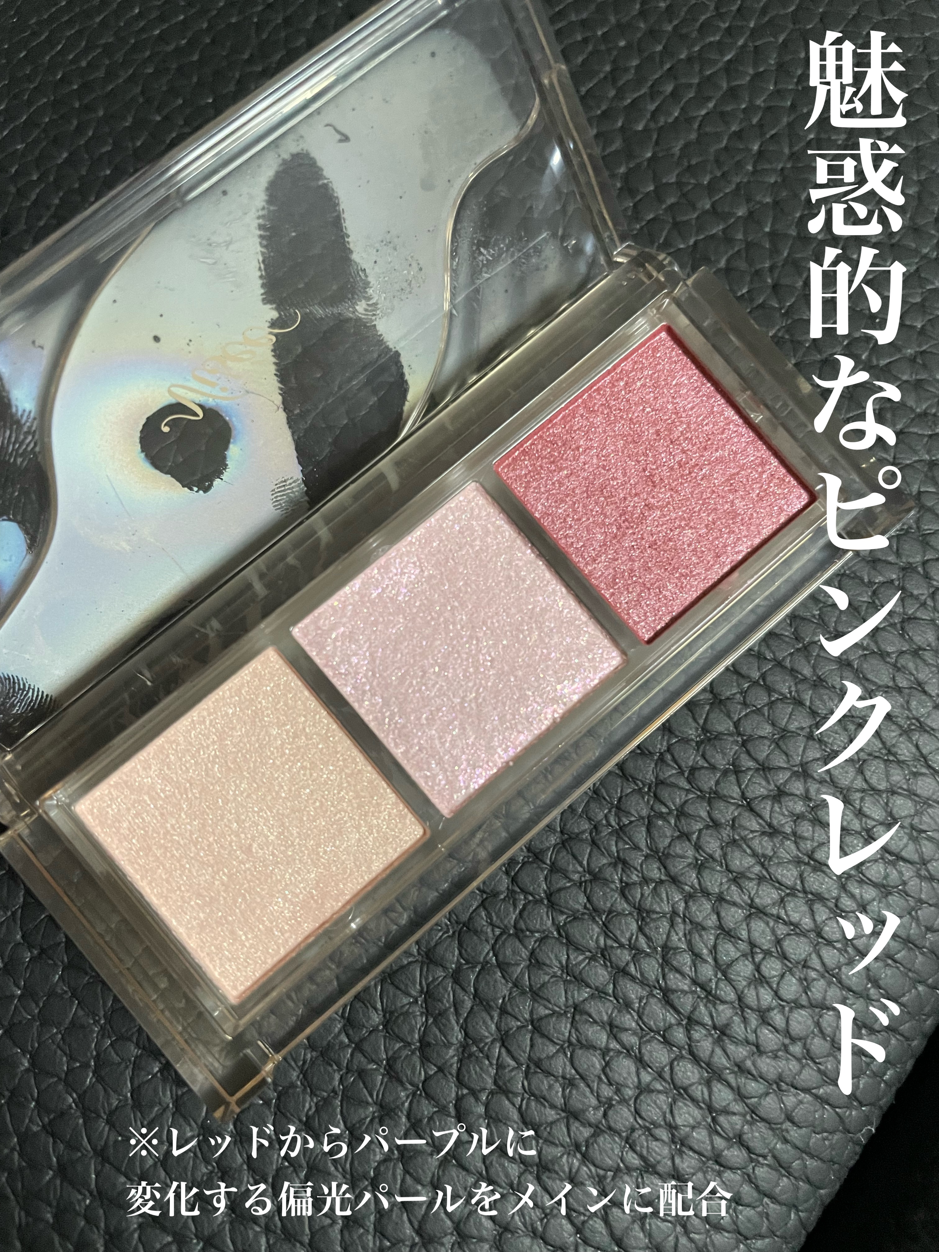 - 角度によって色が変わる高輝度偏光パールを多量配合。動くたび輝きが変化する高密着な3色入りセットアイカラー。 ● 高輝度偏光パールと大粒グリッターを贅沢に配合した、3 色セットのアイカラーです。 まぶたにしっとりとけこむようにフィットして、大粒パールやグリッターも高密着。 大胆に輝き、色気を放つ目もとがつづきます。 ● 見る角度や光の当たり具合により色味が変化する高輝度偏光パール(カラーチェンジグリッター)とクリアで高輝度な大粒グリッターを組み合わせて配合。 まばたきや動きにより色と輝きが変化する、魅力的な目もとを演出します。 ● 化粧もちを高めるフィットオイル成分配合。まぶたにピタッと密着し、パール落ちを防止。 高い透明感とツヤ感も付与し、美しい仕上がりが持続します。 ● カラーによって異なるベースを採用。 [ハイライトカラー(A)] もちっと生質感で、肌にとけこむように密着するスフレベース。 繊細なパールの輝きで、まぶたに光を取りこみ、下地効果でアイカラーの密着も高めます。 [グリッターカラー(B)] 輝きを最大限に引き出す透明性の高いベースに、高輝度偏光パールと大粒グリッターを贅沢に配合。 密着性の高いフィットオイル成分とペーストオイルをかけあわせることで、パール落ちも防止。 [アクセントカラー(C)] のび広がりのよさと高い密着性を両立して美発色を叶えたベース。 フィットオイル成分を最高量配合(パレット内比)し、粉体をコーティングすることで クリアで美しい発色と上質なツヤが持続します。 ● 無香料