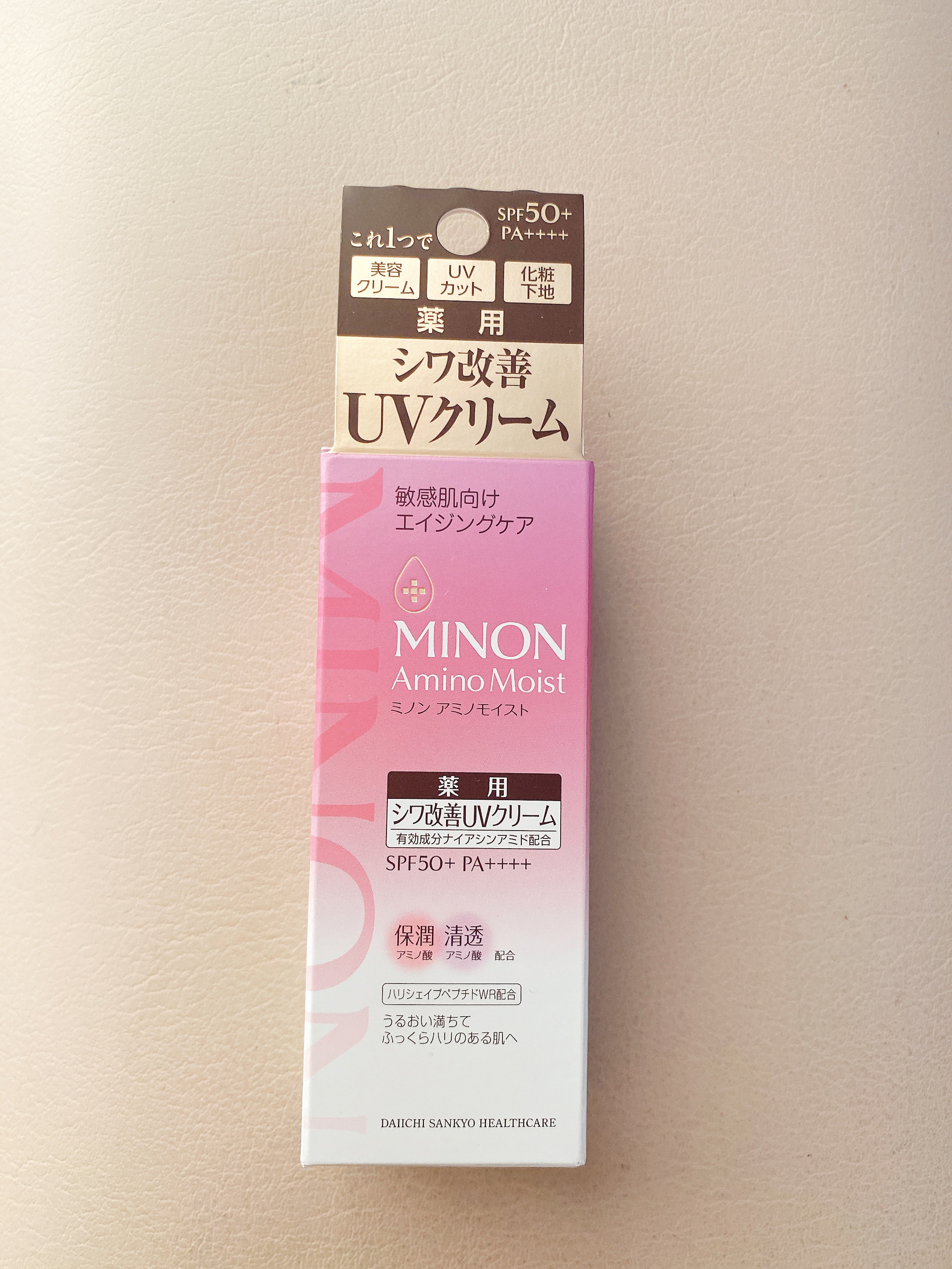 - 【シワ改善もできるUVクリーム】 SPF50+PA++++ シワ改善×UVカットが出来る薬用シワ改善UVクリーム。これ1本で美容クリーム・UVカット・化粧下地の3役。 シワ改善&しみ*予防成分「ナイアシンアミド」、肌あれ予防成分「グリチルリチン酸2K」配合。紫外線吸収剤&酸化亜鉛フリーで敏感肌を考えた処方。自然な輝きを放つ、やわらかなテクスチャーの化粧下地、見る角度で反射色が変わる「艶肌ダブルカラーパウダー」配合で自然な立体感を演出。 エイジングケア:年齢に応じたお手入れケア *メラニンの生成を抑え、しみ・そばかすを防ぐ (販売名:ミノンアミノモイストAU)【医薬部外品】