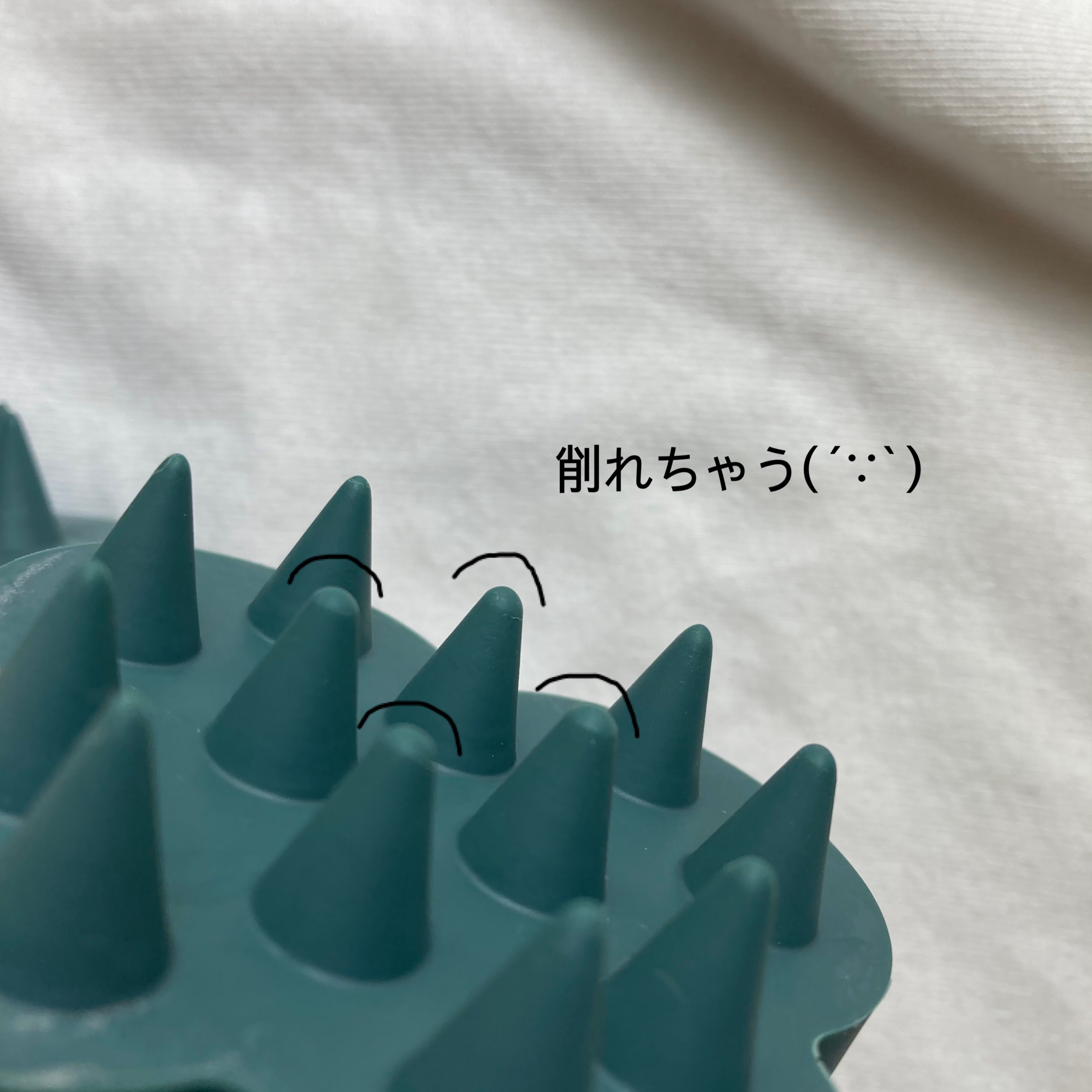 シリコン製でトゲ部分を指で押さえると先端だけフニャと少し曲がり 硬めではあるけど思ってたよりかは柔らかいと感じました この刺激が逆に頭皮に悪いのでは?!と思うほど 痛かったです 全く痛くないです。 むしろコレを使わないと物足りない。 たしか1週間くらいで 痛みよりスッキリする感じになりました 最近気づいたのですが トゲの部分が削れてる⸜( ⌓̈ )⸝ 使い始めて4ヶ月くらいでこれだと 力を入れすぎなのかなー笑