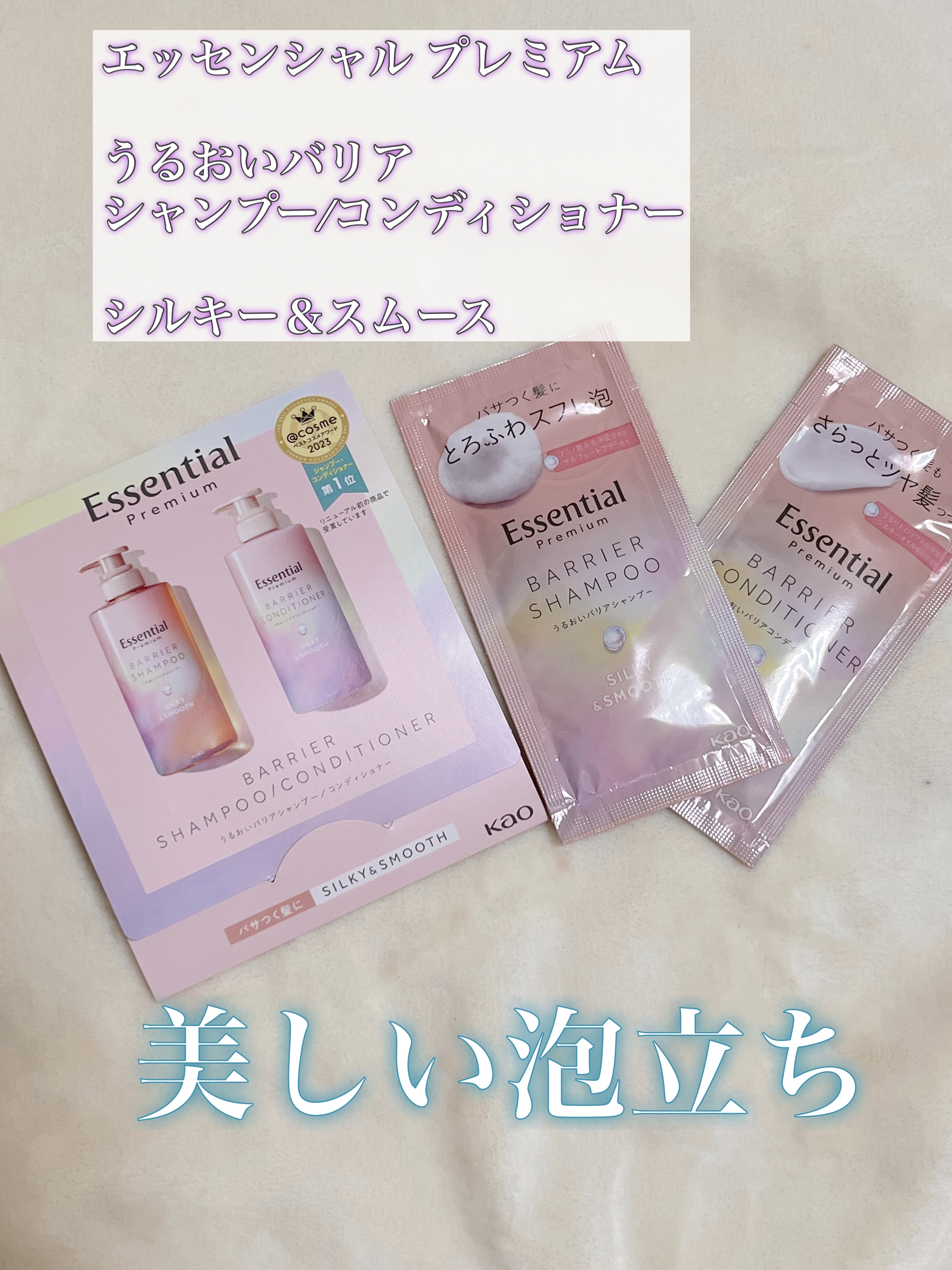 Essentialエッセンシャル🌸エッセンシャルプレミアムバリアシャンプーコンディショナーシルキー&スムースアットコスメ様からお試しサンプル🎁いただきました🐦ありがとうございます💓🪷気持ち良く心地よいとろふわな泡立ちでサラサラツヤツヤスル〜っ...