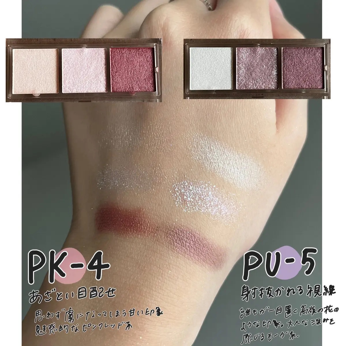 角度や動きによって煌めいて色と輝きが変化する 高輝度偏光パール×大粒グリッターのパレットが新発売! ラメ感は華やかだけど発色はシアーで軽く、デイリーに使いやすい絶妙な色合いの3色構成🫶 クールウィンターの私はもちろんPU-5推し◎ ブルベカラーも豊富で嬉しい☺️🌸