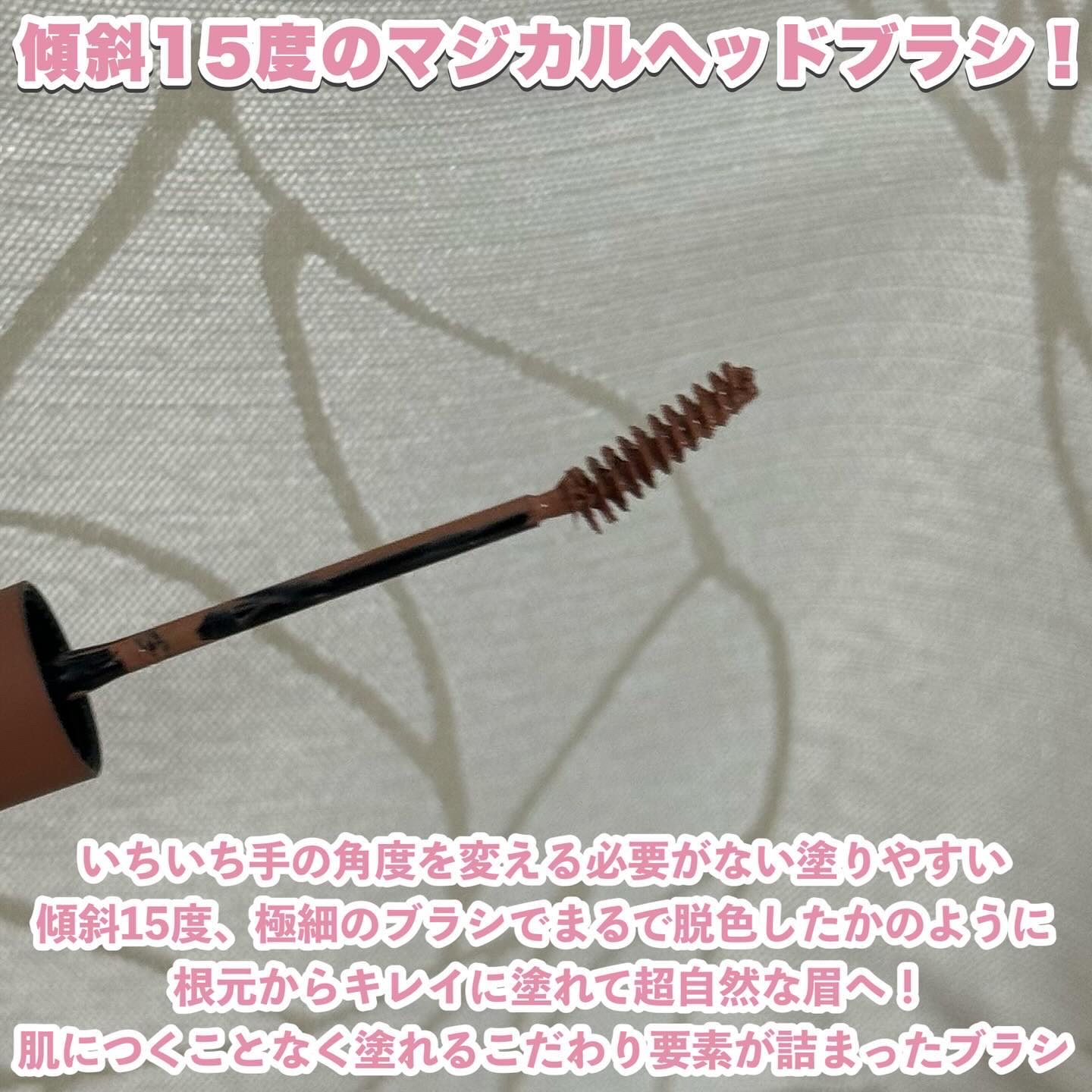 - 15度のマジカルヘッドが決め手!目指したのは“自然×簡単”な垢抜け眉。 ○クリーミーなテクスチャーで柔らかいのにしっかり発色。 ○特殊オイルゲーリング処方。 ゲルのチカラで心地よい塗布感と理想の仕上がりを両立 ・塗るとき:柔らかな使用感 ・塗ったあと:乾燥し毛流れを固定 ○眉毛1本1本をしなやかにコーティング。 ・フィルムフォーマーだから汗、水、皮脂に強いスマッジプルーフを実現。 ○4つのフリー 合成香料フリー/パラベンフリー/防腐剤フリー/動物実験フリー ○美容成分高配合(保湿効果) アルガニスピノサ核油/アンズ核油/カニナバラ果実油/ダイズ種子エキス/ハチミツエキス/ツバキ種子油