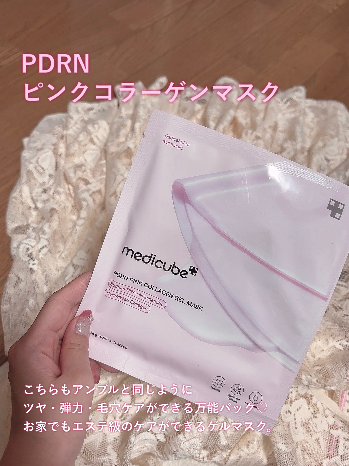 肌が若返るmedicubeのピンク メディキューブで今大人気のピンクのアンプルとアンプル好きな人は絶対合わせて使って欲しいコラーゲンゲルマスク🌷🩰 食べる美容液とも呼ばれるサーモンPDRN DNAに近い成分でコラーゲンの合成をサポートキレイなピンク色はビタミンB12の本来の色なの! マスクはとにかくぷるっぷる...!! 時間が経つとどんどん透けてくる面白い構造剥がした時に小さいのが3つ出てくるんだけどそれはほうれい線や眉間に使えるよ🙆🏻♀️無駄なし!