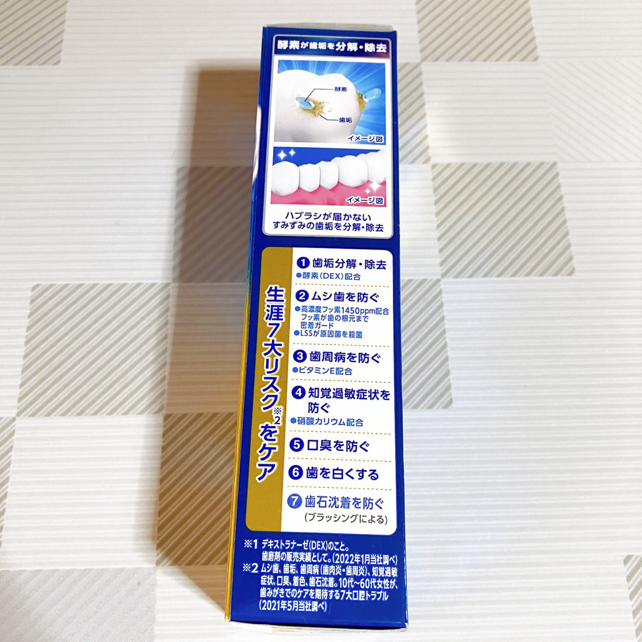 歯はつるつるに磨けるし 7大リスクケアって書いてあるだけあって効果・効能がいろいろすごい。 なによりめっちゃ気合い入れて磨いてもはぐきしみないな?と思ったらそういう効果もあったw 虫歯や歯周病予防だけでなく、知覚過敏やらなんやら一度に叶えたい!を叶える欲張り歯みがき粉。