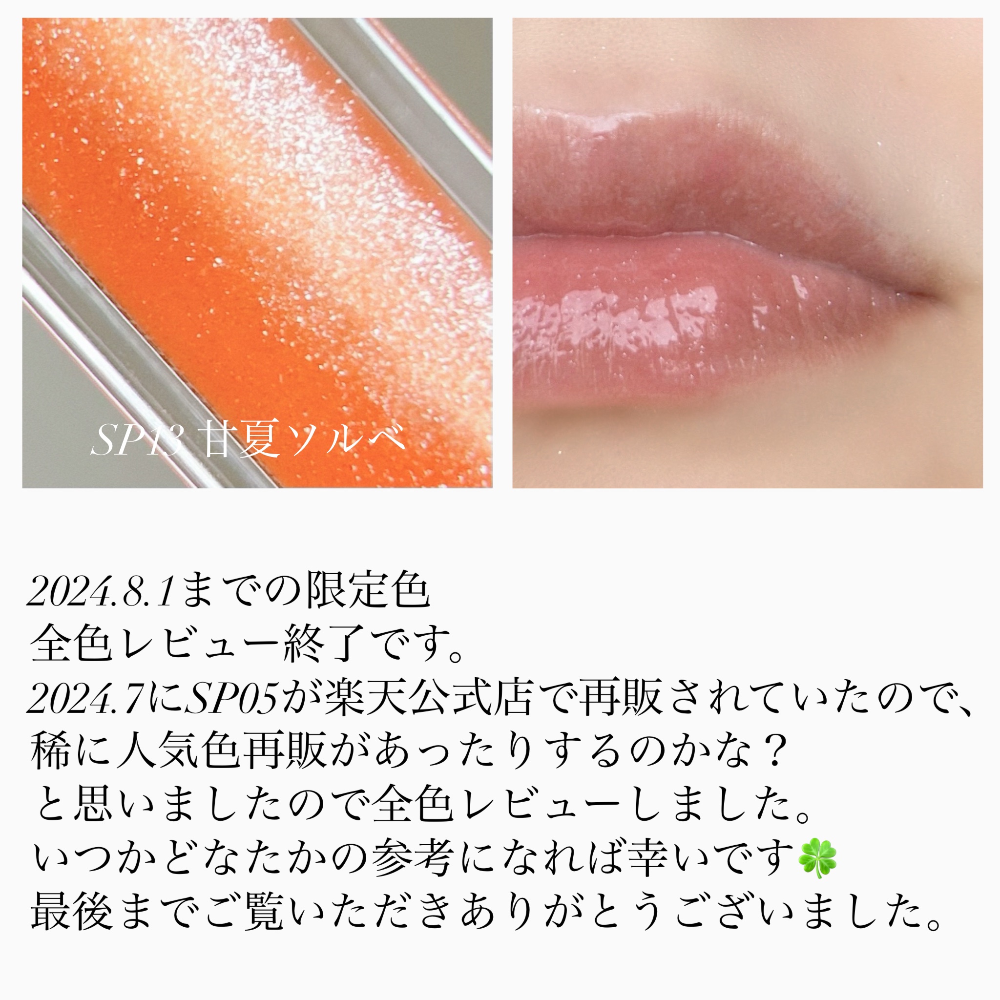 唇用美容液のプランパー配合で塗ると少しピリピリしますがそれがまた◎ リッププランパーにしては発色がハッキリとしたものもあり使えば使う程にちゅるんリップに 個人的には『SP12ピオーネソルベ』と、『SP14パウダーローズ』がお気に入りです‼️