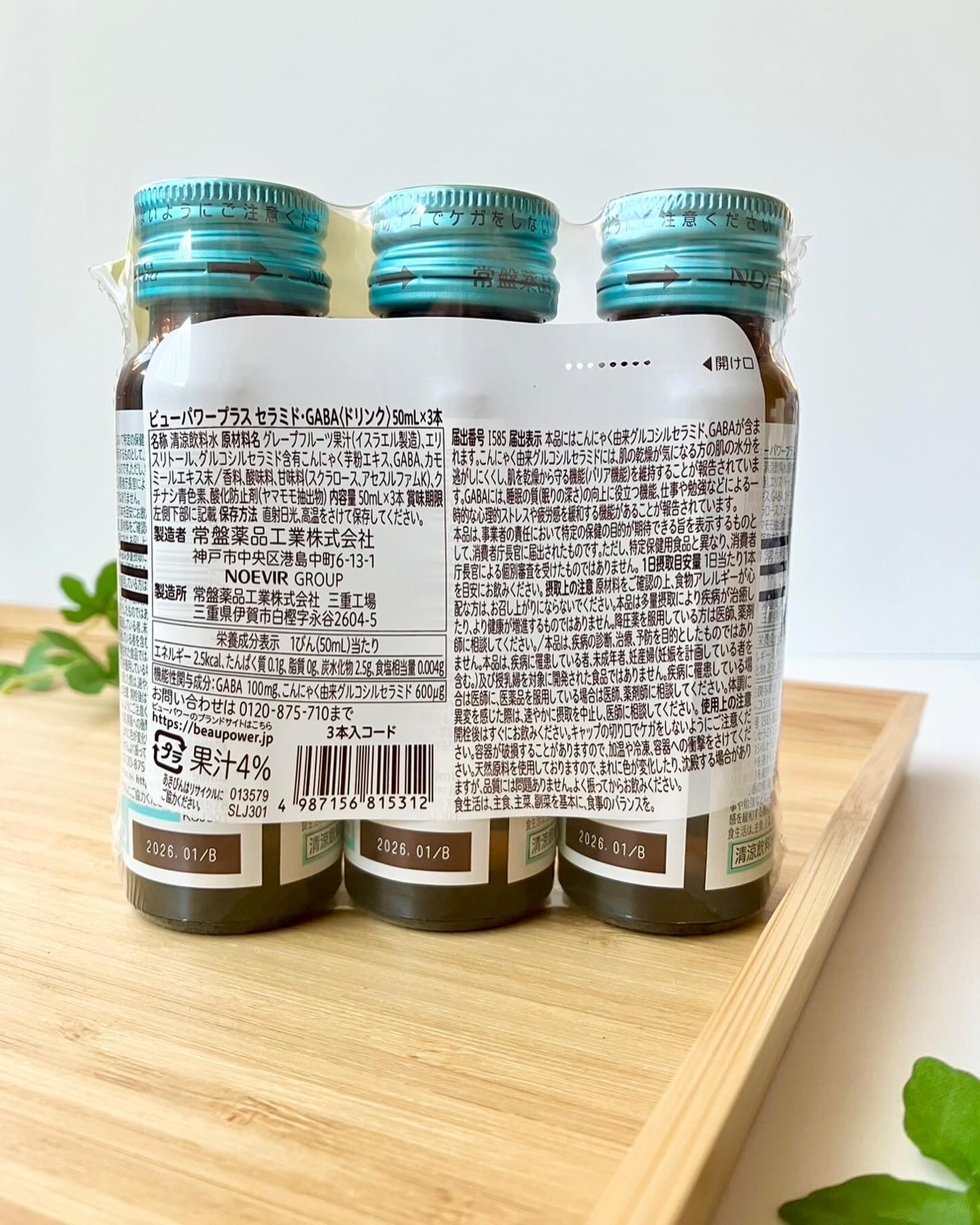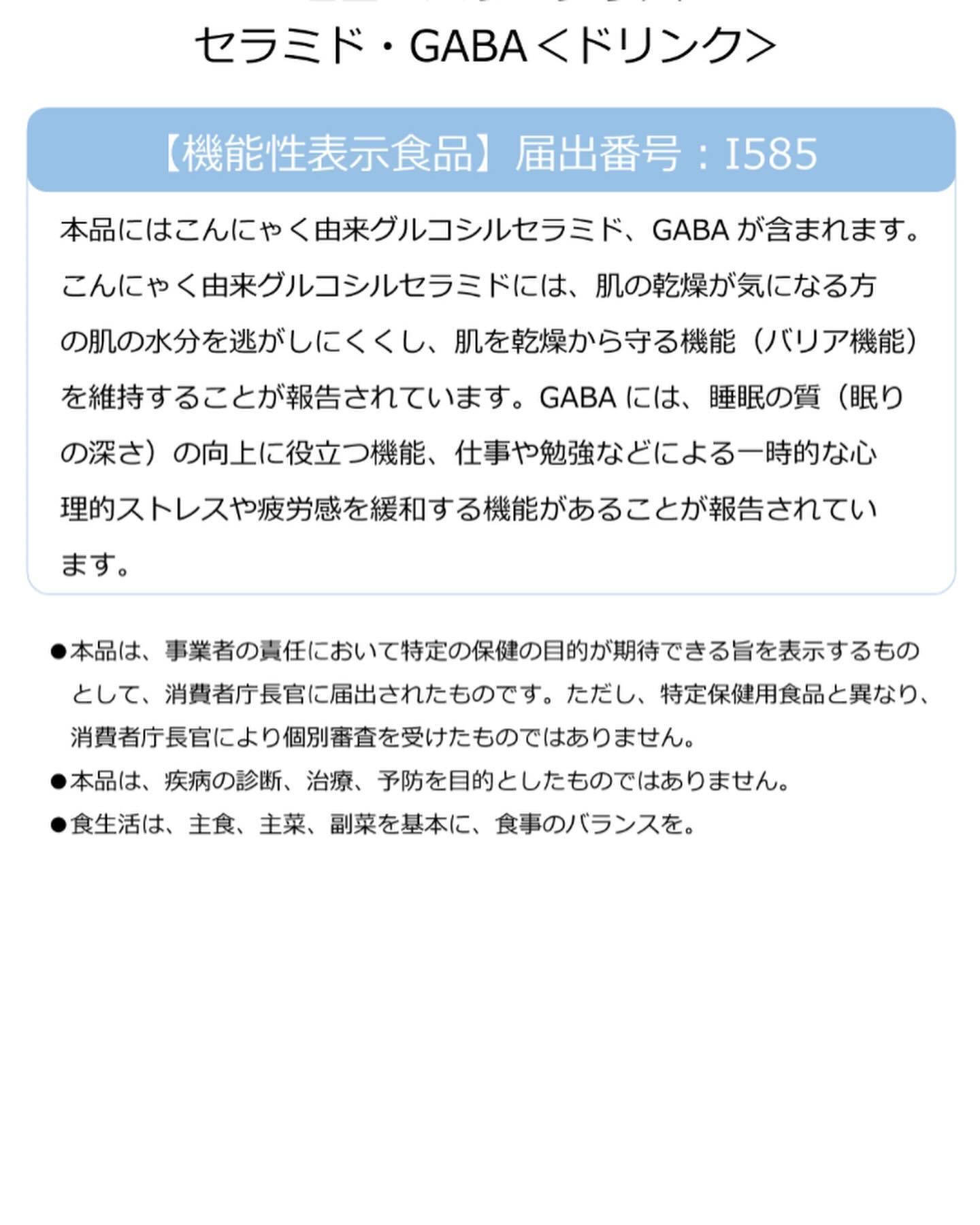 肌の乾燥が気になる方の肌の水分を逃がしにくくし、肌を乾燥から守る機能(バリア機能)を維持するこんにゃく由来グルコシルセラミド 睡眠の質(眠りの深さ)の向上に役立つ、仕事や勉強などによる一時的な心理的ストレスや疲労感を緩和するGABA お肌の潤いケアだけでなく、睡眠の質の向上をサポートなど、Wケアできるところがとても魅力的なドリンク✨