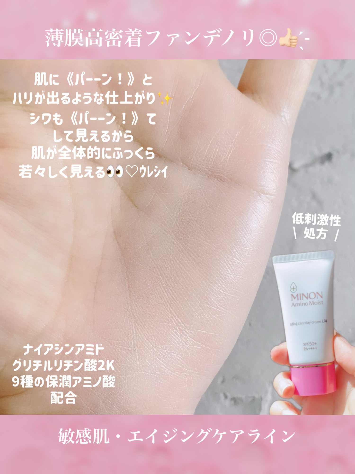 - 【シワ改善もできるUVクリーム】 SPF50+PA++++ シワ改善×UVカットが出来る薬用シワ改善UVクリーム。これ1本で美容クリーム・UVカット・化粧下地の3役。 シワ改善&しみ*予防成分「ナイアシンアミド」、肌あれ予防成分「グリチルリチン酸2K」配合。紫外線吸収剤&酸化亜鉛フリーで敏感肌を考えた処方。自然な輝きを放つ、やわらかなテクスチャーの化粧下地、見る角度で反射色が変わる「艶肌ダブルカラーパウダー」配合で自然な立体感を演出。 エイジングケア:年齢に応じたお手入れケア *メラニンの生成を抑え、しみ・そばかすを防ぐ (販売名:ミノンアミノモイストAU)【医薬部外品】