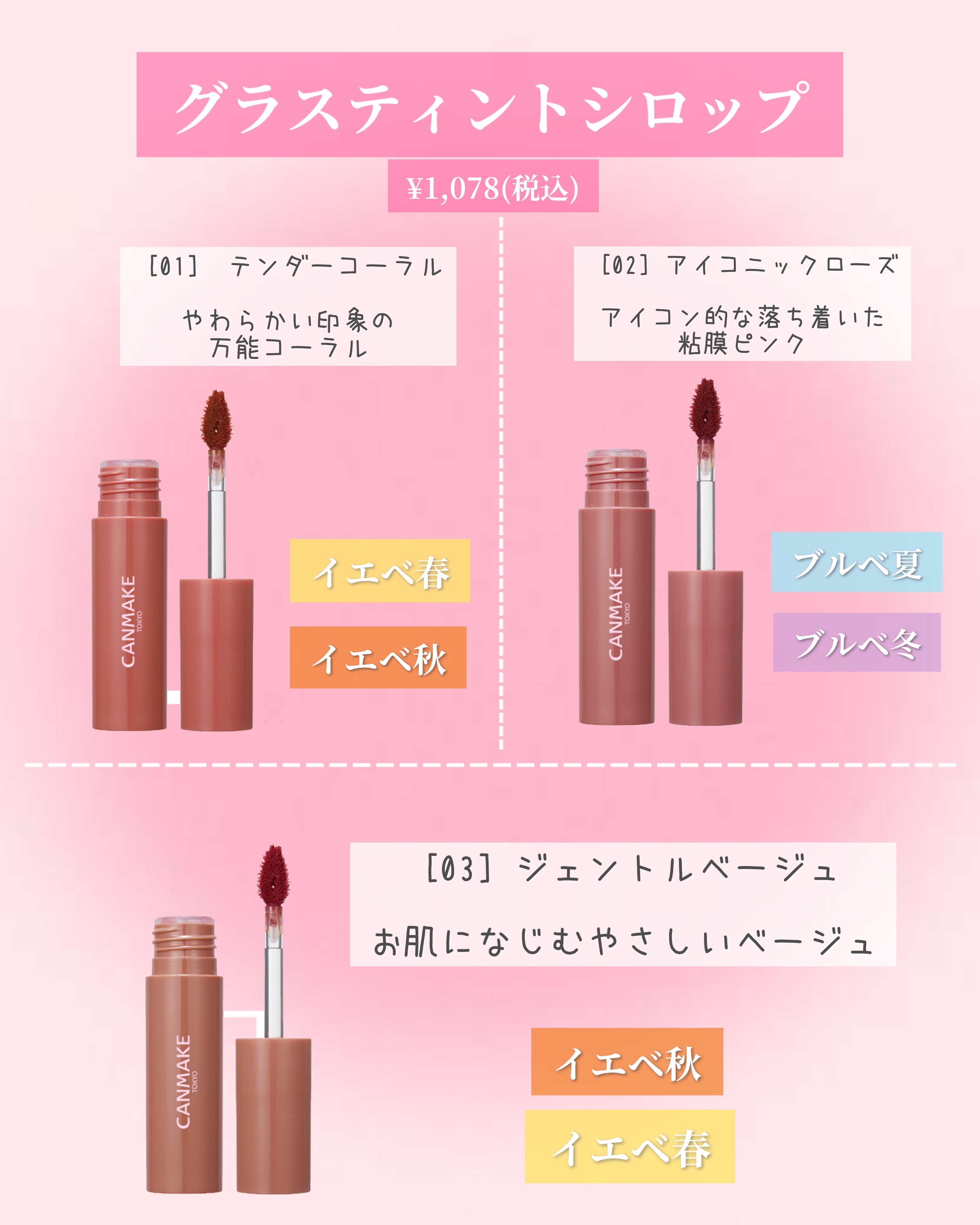 CANMAKEのグラスティントシロップ💄ティントだけどベタっとならずに唇に密着♡ガラスのようなツヤとクリアな透明感を演出してくれるから透け感が出るぽわんと可愛い唇に仕上がるよ✨くすみっぽい大人な色で大人な雰囲気にも、甘くて可愛い雰囲気にもデイ...