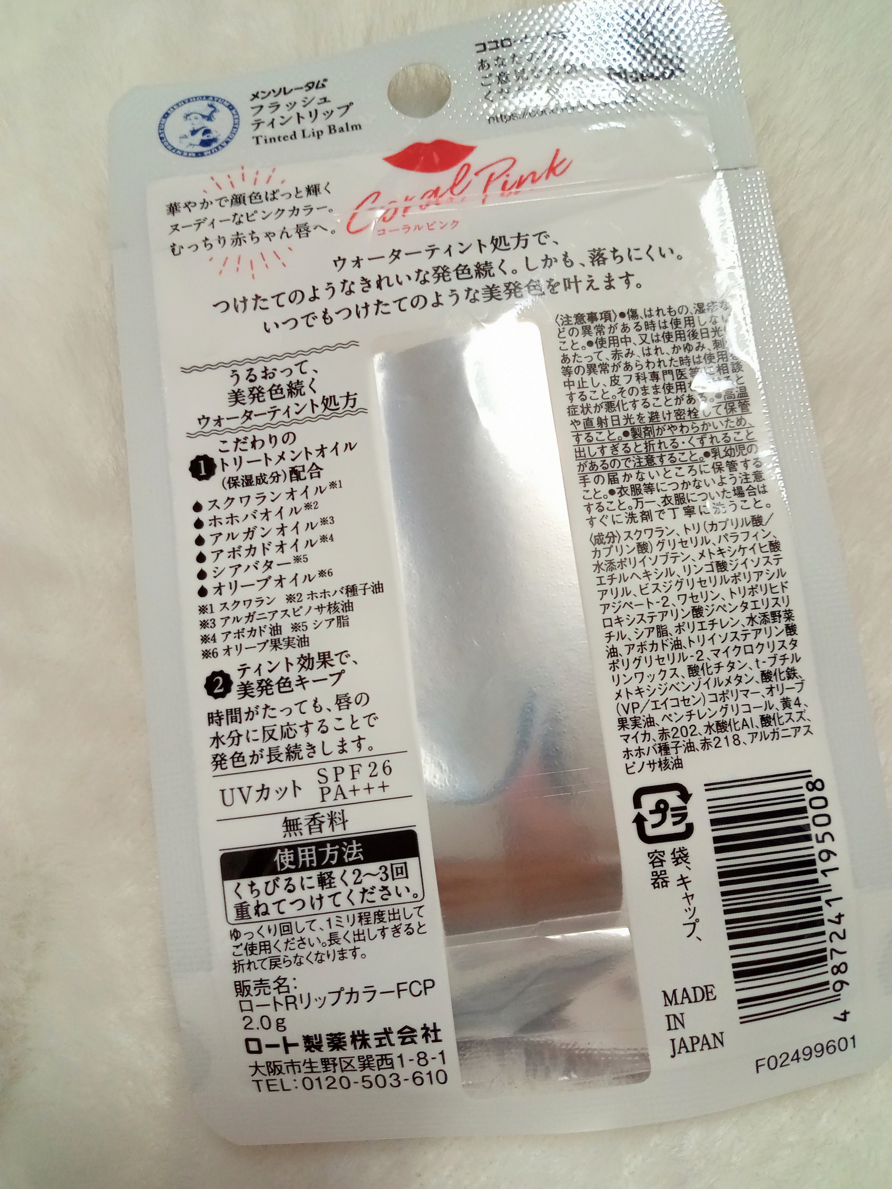 - ※商品パッケージは予告なく変更する場合がありますのでご了承ください。 ウォーターティント処方を採用。 唇の水分に反応し、発色が長続きする色つきリップです。 UVカット(SPF26、PA+++)。無香料。