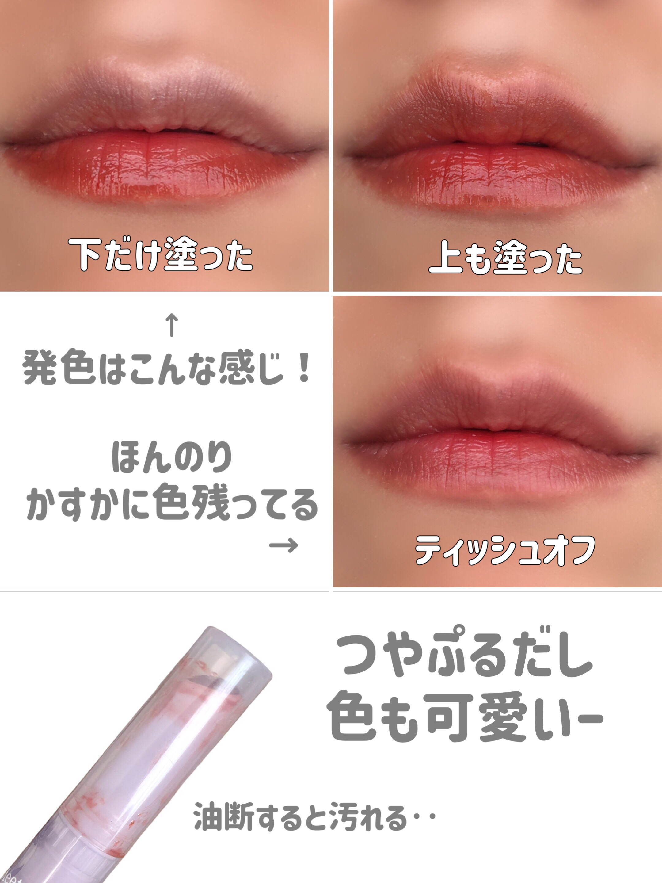 なんだろうこの付け心地、、 なんにも塗ってないような軽さ! うるうる系も好きだけど、 この密着感あるのも好き! すっぴんでも塗れるリップ! 全く顔から浮かなくて 顔が明るくなる血色リップ♡ ベースとしても使えるよ ティッシュオフにもめちゃくちゃ強い 液体ティントには敵わないけど、 色持ちも🙆♀️