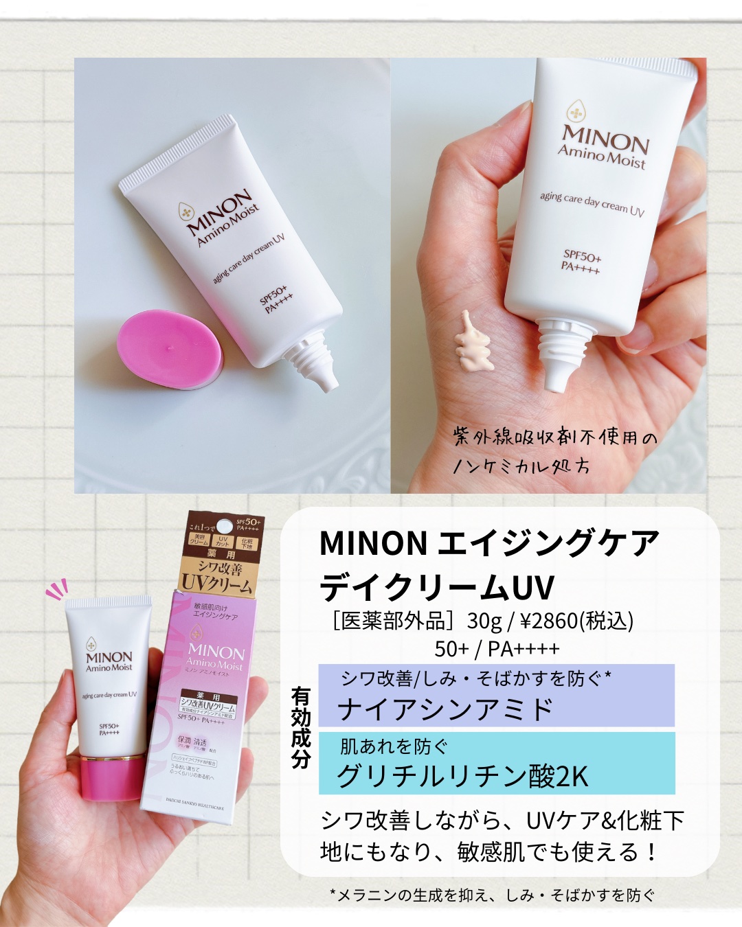 - ãã·ã¯æ¹åãã§ããUVã¯ãªãŒã ã SPF50ïŒPAïŒïŒïŒïŒ ã·ã¯æ¹åÃUVã«ãããåºæ¥ãè¬çšã·ã¯æ¹åUVã¯ãªãŒã ããã1æ¬ã§çŸå®¹ã¯ãªãŒã ã»UVã«ããã»åç²§äžå°ã®3圹ã ã·ã¯æ¹åïŒãã¿*äºé²æåããã€ã¢ã·ã³ã¢ããããèããäºé²æåãã°ãªãã«ãªãã³é ž2Kãé åã玫å€ç·åžåå€ïŒé žåäºéããªãŒã§ææèãèããåŠæ¹ãèªç¶ãªèŒããæŸã€ããããããªãã¯ã¹ãã£ãŒã®åç²§äžå°ãèŠãè§åºŠã§åå°è²ãå€ãããè¶èããã«ã«ã©ãŒããŠããŒãé åã§èªç¶ãªç«äœæãæŒåºã ãšã€ãžã³ã°ã±ã¢ïŒå¹Žéœ¢ã«å¿ãããæå ¥ãã±ã¢ *ã¡ã©ãã³ã®çæãæãããã¿ã»ãã°ãããé²ã (販売åïŒããã³ã¢ããã¢ã€ã¹ãAU)ãå»è¬éšå€åã