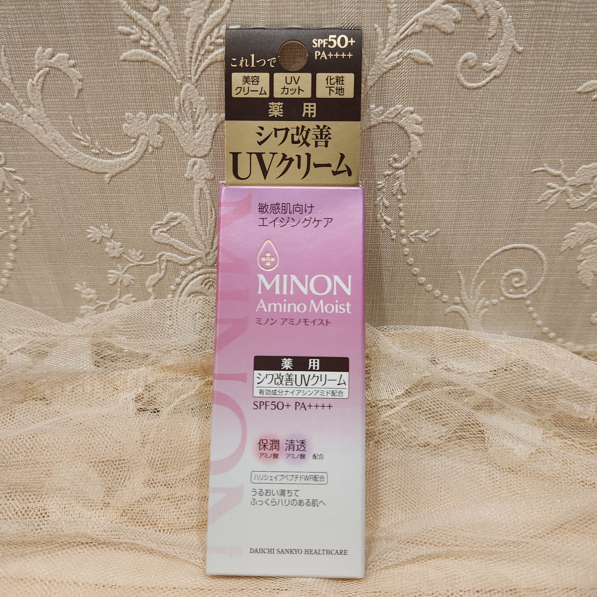 - 【シワ改善もできるUVクリーム】 SPF50+PA++++ シワ改善×UVカットが出来る薬用シワ改善UVクリーム。これ1本で美容クリーム・UVカット・化粧下地の3役。 シワ改善&しみ*予防成分「ナイアシンアミド」、肌あれ予防成分「グリチルリチン酸2K」配合。紫外線吸収剤&酸化亜鉛フリーで敏感肌を考えた処方。自然な輝きを放つ、やわらかなテクスチャーの化粧下地、見る角度で反射色が変わる「艶肌ダブルカラーパウダー」配合で自然な立体感を演出。 エイジングケア:年齢に応じたお手入れケア *メラニンの生成を抑え、しみ・そばかすを防ぐ (販売名:ミノンアミノモイストAU)【医薬部外品】