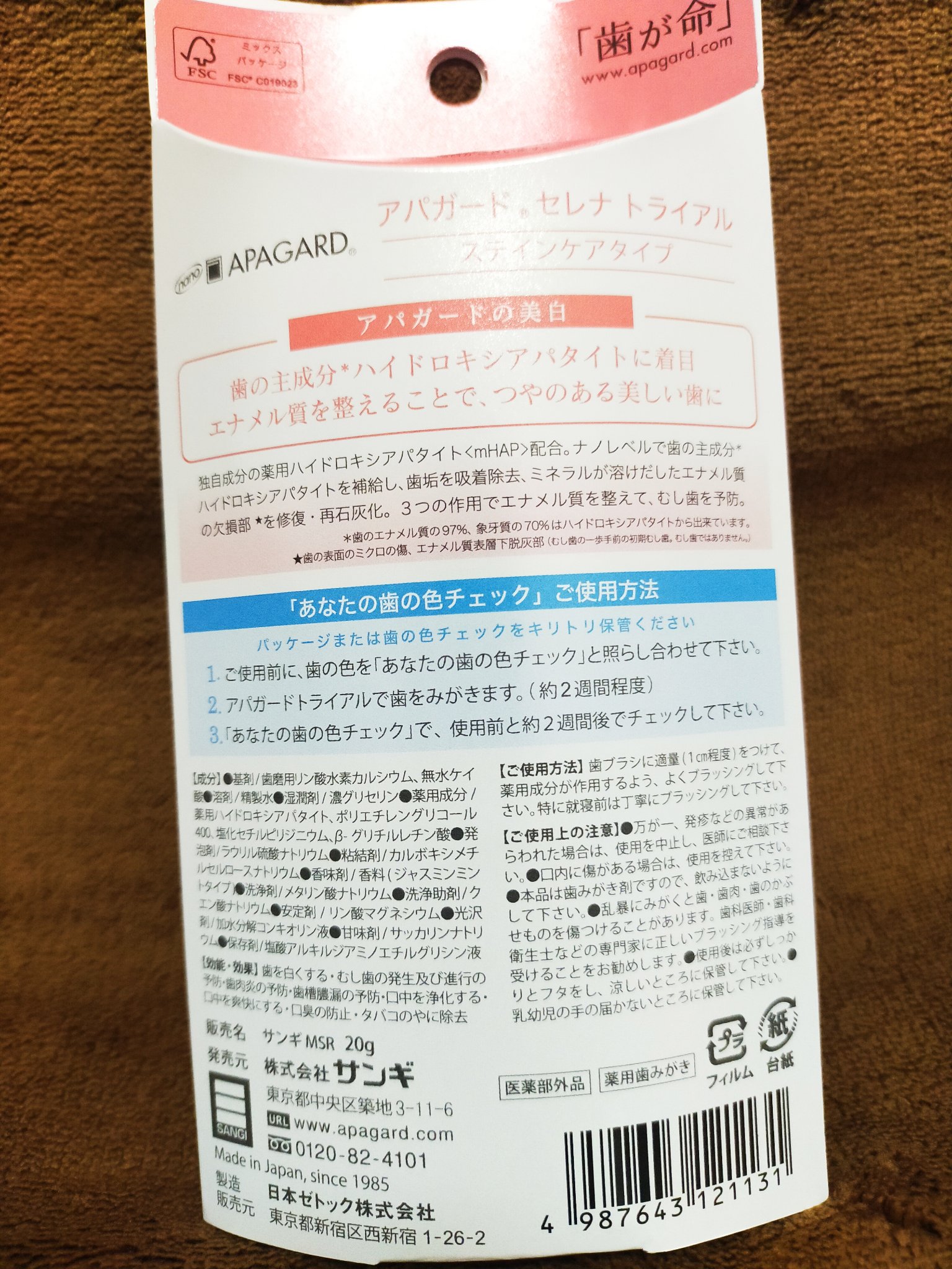 アパガードセレナ53g・アパガードクリスタル歯ブラシ(1本)モニターキャンペーンで、美白歯みがき「アパガード」シリーズのステインケアタイプを提供していただきました👏サンギ開発のむし歯予防成分「薬用ハイドロキシアパタイト」を配合☝️̖́-︎...