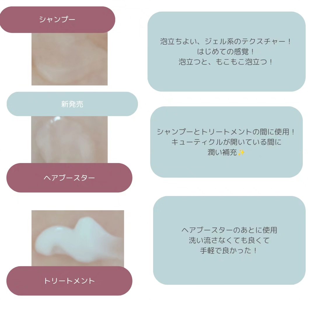 朝、髪がまとまらない原因の1つは髪の水分不足 保水ケア美容で、朝起きてから1日中素直にまとまるツヤ髪へ シャンプーは泡立ち良く洗いやすい印象 ヘアブースターはとろみのあるテクスチャでスッと馴染んでくれてました! 香りはホワイトフリージア&グリーン 清潔感のある優しい香りがお気に入り!
